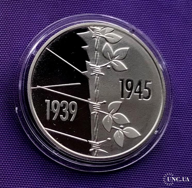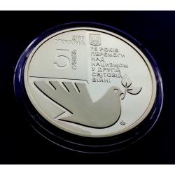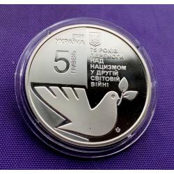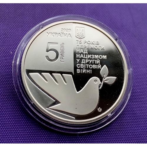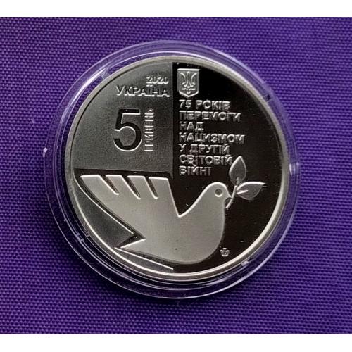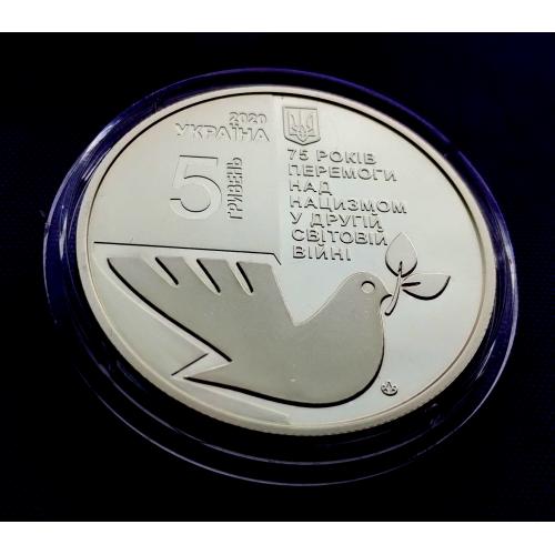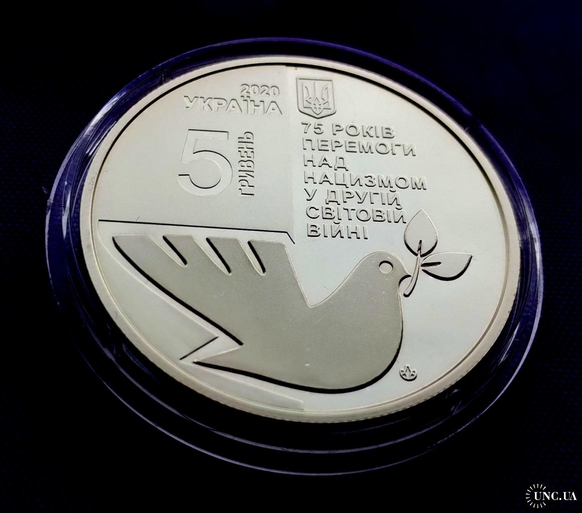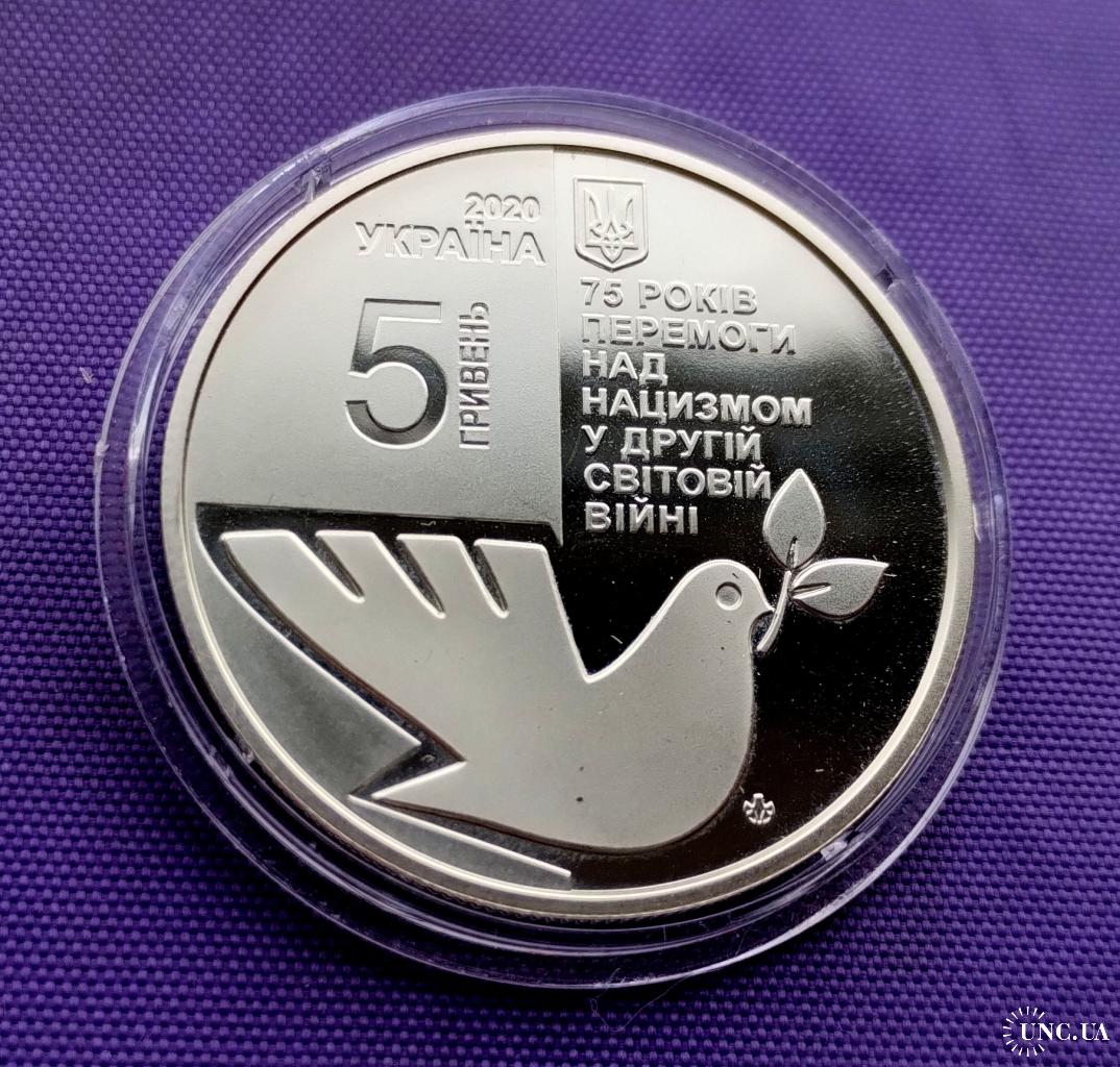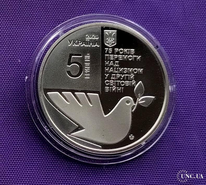 Оригинал5 гривень 2020 року, 75 років перемоги над нацизмом у другій світовій війні, стан монети по світлинах, в капсулі