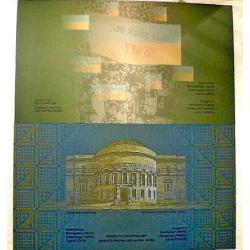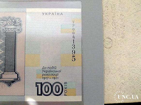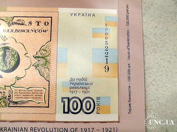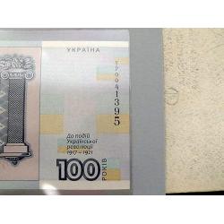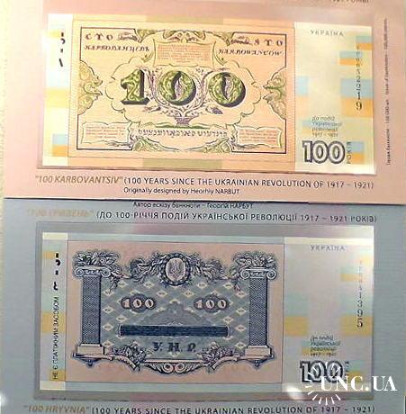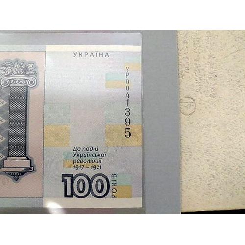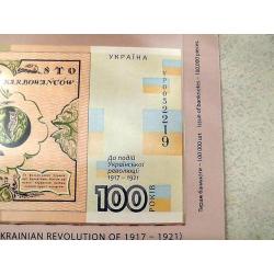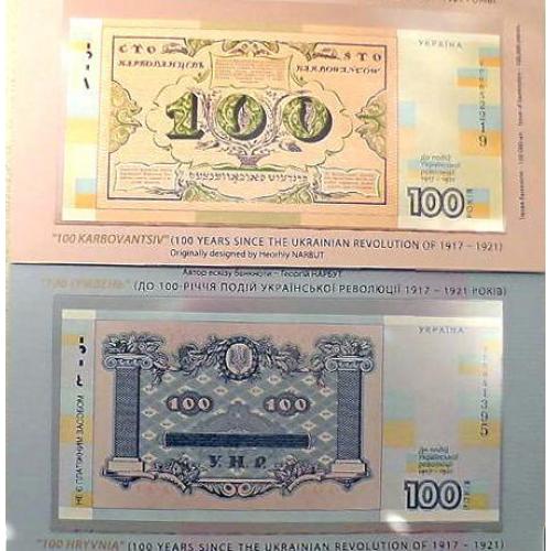 Сувенірна банкнота `Сто гривень` відтворює дизайн української банкноти номінальною вартістю 100 гривень, введеної в обіг 17 жовтня 1918 року. Навесні 1918 року український уряд ухвалив рішення змінити назву вітчизняних грошей із `карбованців` на `гривні`, бажаючи підкреслити спадковість традицій державотворення з часів Київської Русі. Найціннішою з мистецького погляду була купюра номіналом 100 гривень, розроблена і виконана Г. Нарбутом, на якій зображено пишний вінок із квітів, плодів, овочів, пшениці. Обабіч стоять жінка в національному вбранні зі снопом пшениці та серпом у руці і чоловік у фартуху, що спирається на молот, обвитий лавром. Написи зворотного боку включено у великий картуш із рослинно-плодового орнаменту, а по боках - декоративні колони. Увінчує всю композицію тризуб, обрамлений лавровим вінком. Банкнота виготовлена на папері з водяним знаком (зображення тризуба). Її розміри: 80 х 170 мм.