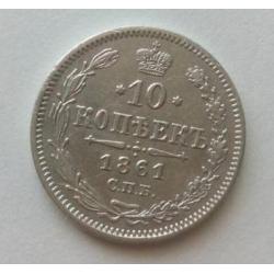 Оригинал10 копійок 1861 року без инициалів, гурт пунктир. З обігу.