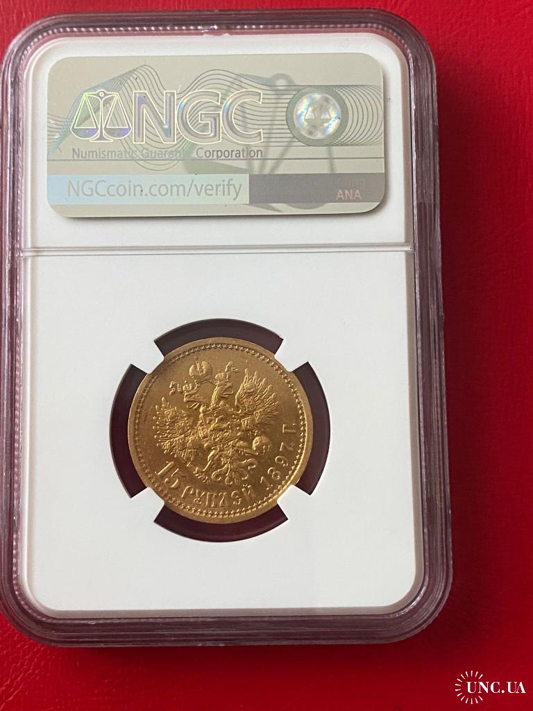 Оригинал15 рублей 1897 года Слаб NGC AU58