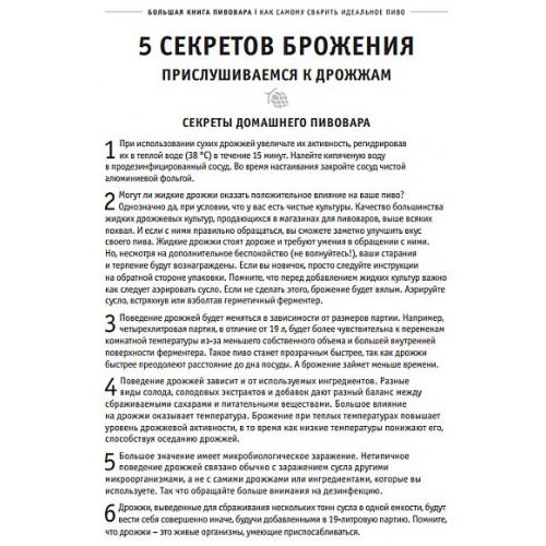 В «Большой книге пивовара» вы узнаете секреты приготовления настоящего качественного пива, а также получите познавательную информацию о преимуществе домашнего пивоварения сегодня. Каждый отдельно взятый рецепт усовершенствован автором с учетом доступных ингредиентов и новой информации. Для новичков, продвинутых пивоваров и профессионалов подобраны отдельные ин- струкции, схемы и рекомендации. Новичкам рекомендуется сначала ознакомиться с основами пивоварения, а затем приступать к освоению сложных рецептов. Помимо секретов пивоварения, вы узнаете много интересных исторических фактов о пиве и разнообразии стилей.