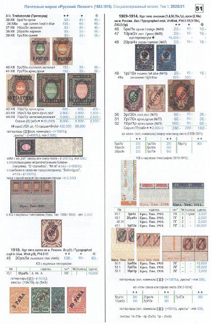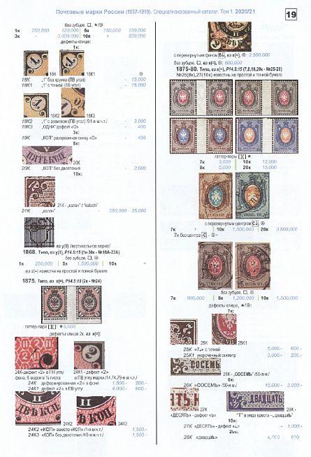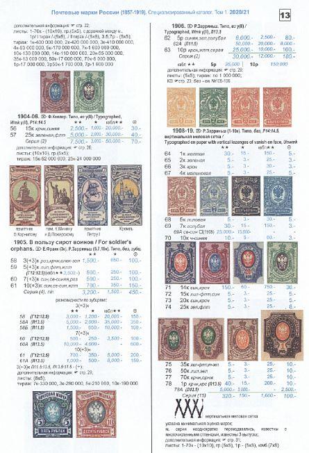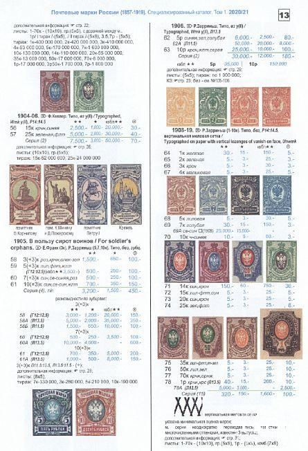 В первом томе каталога в редакции 2020/21 приводится информация о выпусках почтовых марок России (1857-1919 гг.), а также Русской почты за рубежом 1860-1920 гг. (Ближнего Востока /“Русского Леванта”/, Китая, временной почты на о. Крит /Ретимнон/), Великого Княжества Финляндского (1856-1917 гг.), Царства Польского (1860-1914 гг.), Молдавии (1858), Вендена (1862-1901 гг.), Тифлиса (1856), почты на территории Восточного Туркестана, Бухарского эмирата и Хивинского ханства. Дается информация о некоторых гашениях.