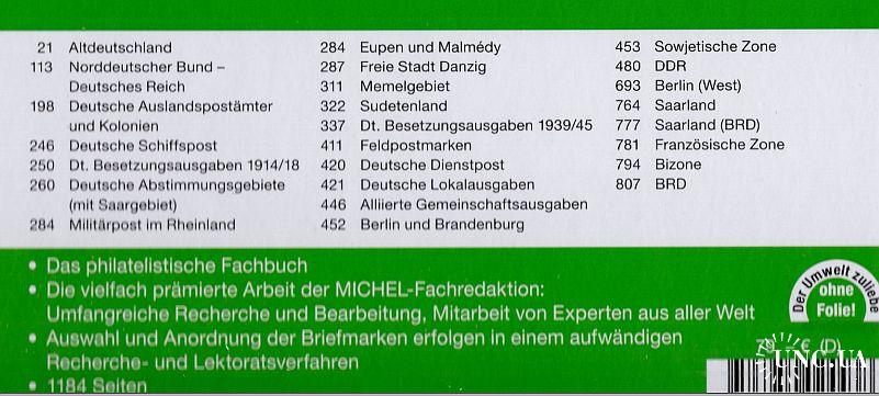 Содержание: Старая Германия, Северо-Германская Конфедерация и Германская Империя, иностранные почтовые отделения, колонии, доставка почты за границу, вопросы оккупации, избирательные участки, бельгийский военный пост в Рейнской области, Эйпен, Мальмеди, Данциг, Мемель, Судетская область, полевые почтовые марки, местные проблемы, Союзная оккупация, ГДР, Берлин (Запад), Саар с расходами OPD, Федеративная Республика Германия.