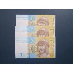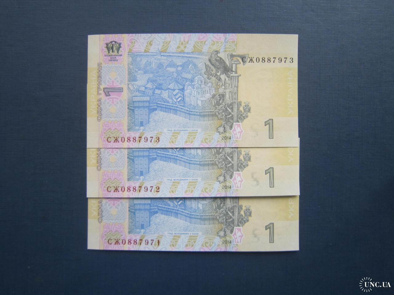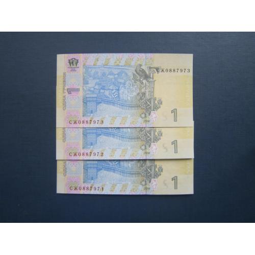 3 банкноти 1 гривня Україна 2014 Гонтарева серія СЖ UNC прес номери подряд разом