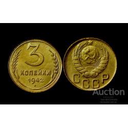 Монета СССР 3 копейки 1942 года. Шла война, монеты в военное время выпускались небольшими тиражами, качество чеканки было довольно низким. В то же время монеты военного времени являются редкими. На аверсе монеты номинал и год выпуска, по бокам два колоса, стебли которых внизу пересекаются и образуют замкнутый круг. На обратной стороне государственный герб, внизу аббревиатура СССР.