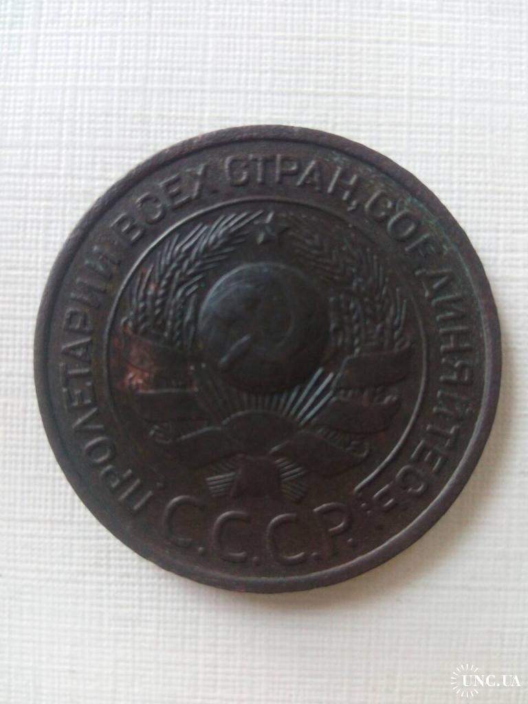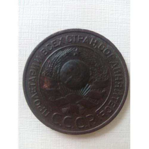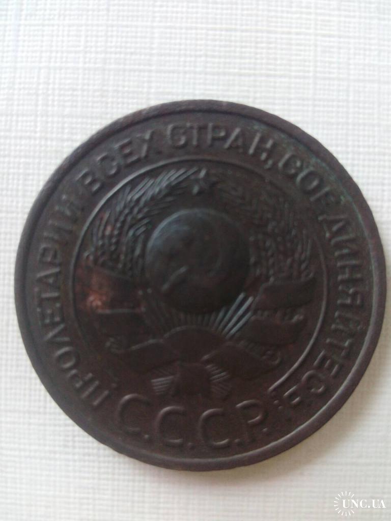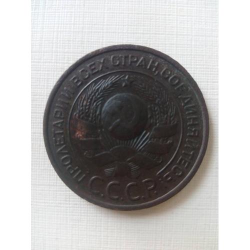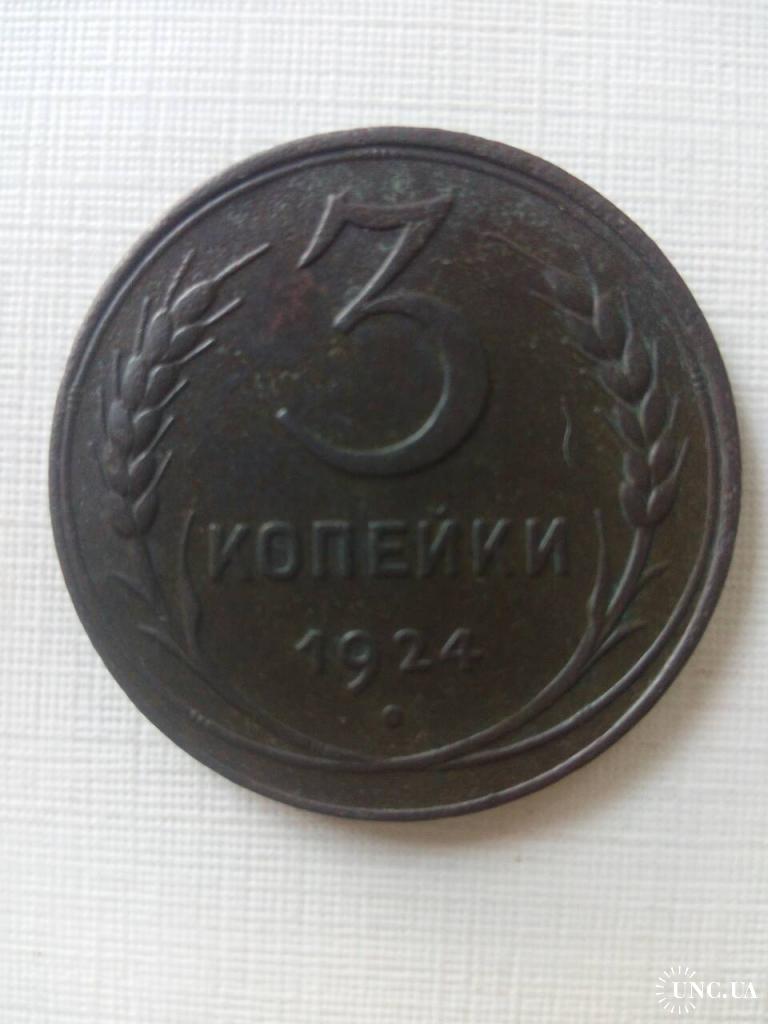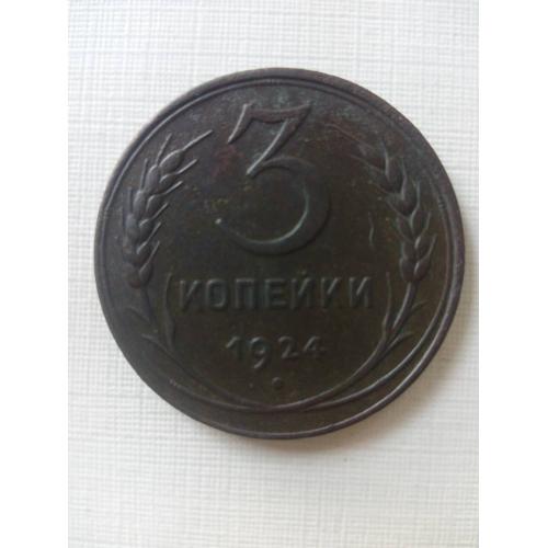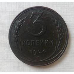 Оригинал3 копійки 1924 року в колекційному стані варіант 4а -R, промінь торкається ленти.