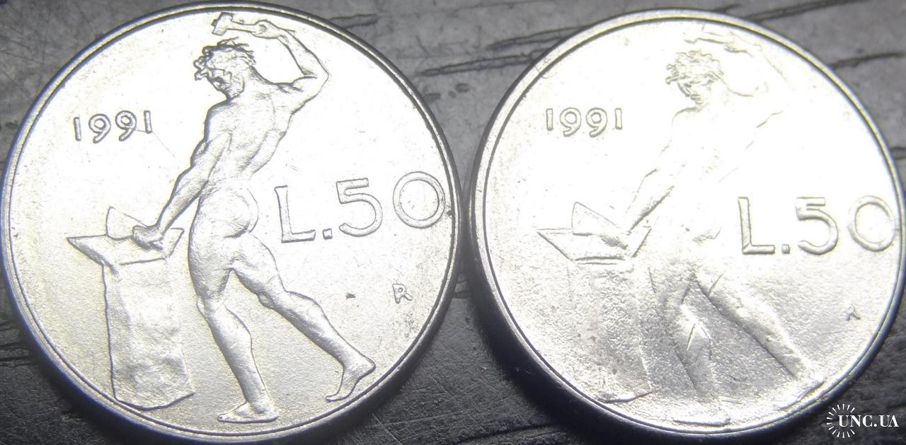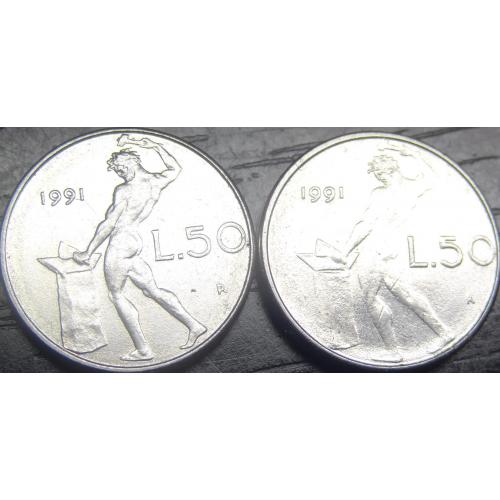 50 lire Italy 1991 with and without diamond / 50 лір 1991 Італія (два різновиди) з ромбом та без