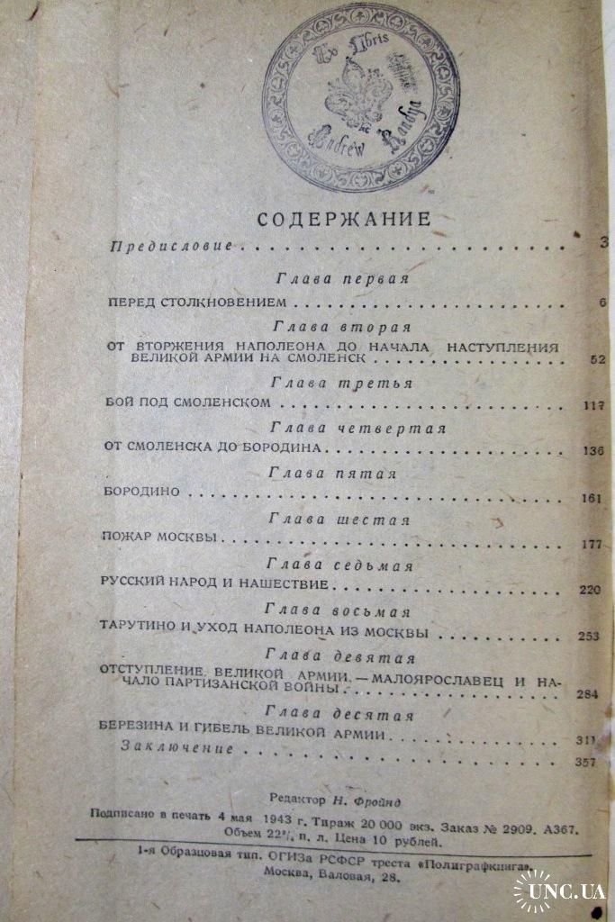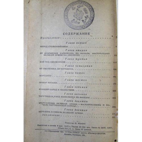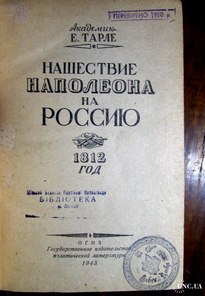 Представляем сегодня Вашему вниманию редкую антикварную книгу эпохи II-й мировой войны -2-е, исправленное и дополненное прижизненное издание 1943 года авторитетного исследования крупнейшего отечественного историка академика Евгения Викторовича Тарле (1874-1955), посвященное нашествию войск императора Наполеона на Российскую империю в 1812 году. 1-е издание этой книги было напечатано в 1937 году.