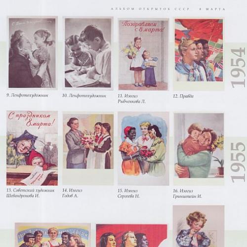 На основе частных собраний поздравительной открытки, зримо представлена трансформация идеологических символов советской эпохи в образы весны, материнства, любви. Процессы, реально отразившие постепенное превращение женского варианта пролетарской солидарности, в день Женщины.