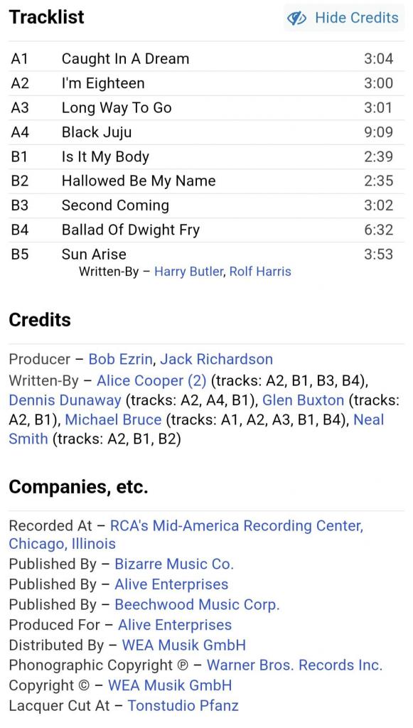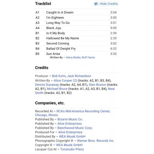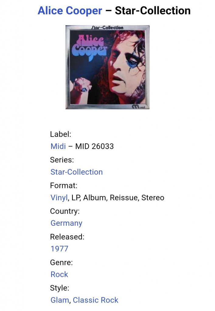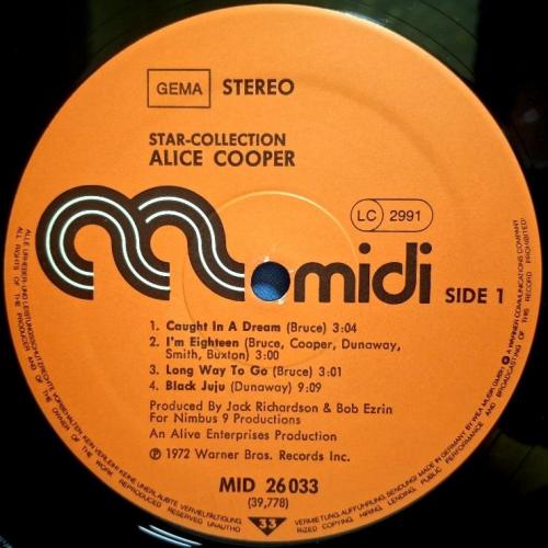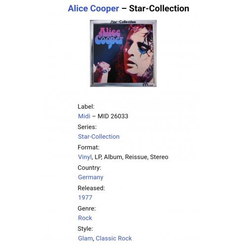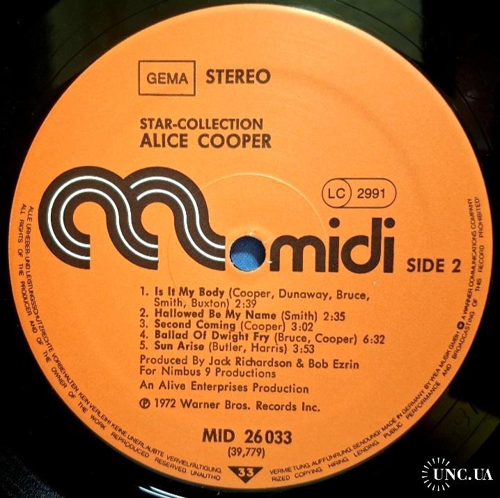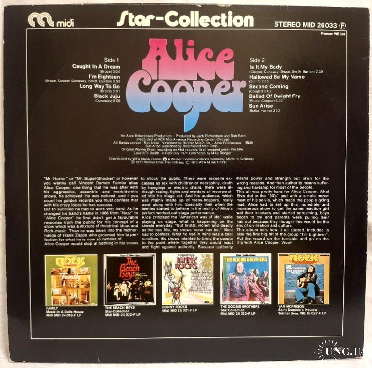 Вінілова платівка. Офіційна збірка найкращих ранніх хітів, Американського короля жаху та майстра епатажу, володара титулів Зали Слави рок-н-ролу, зірки Голлівудської Алеї Слави, почесного доктора Heritage Award, музичного виконавця стилів шок-рок, хард-рок, глем метал, Вінсента Деймона Фурньє, більше відомого під сценічним ім'ям Еліс Купер (Star Collection) 1969-75. Випуск фірми (Midi) Germany, 1977-ий рік. Оригінальне Німецьке видання. Стан платівки NM-. Конверт глянцевий. Стан конверту ЕХ+. Відправка по Україні службами доставки: Нова Пошта, Укр Пошта, Делівері. Також відправляємо посилки за кордон по цілому світу.