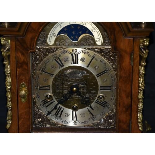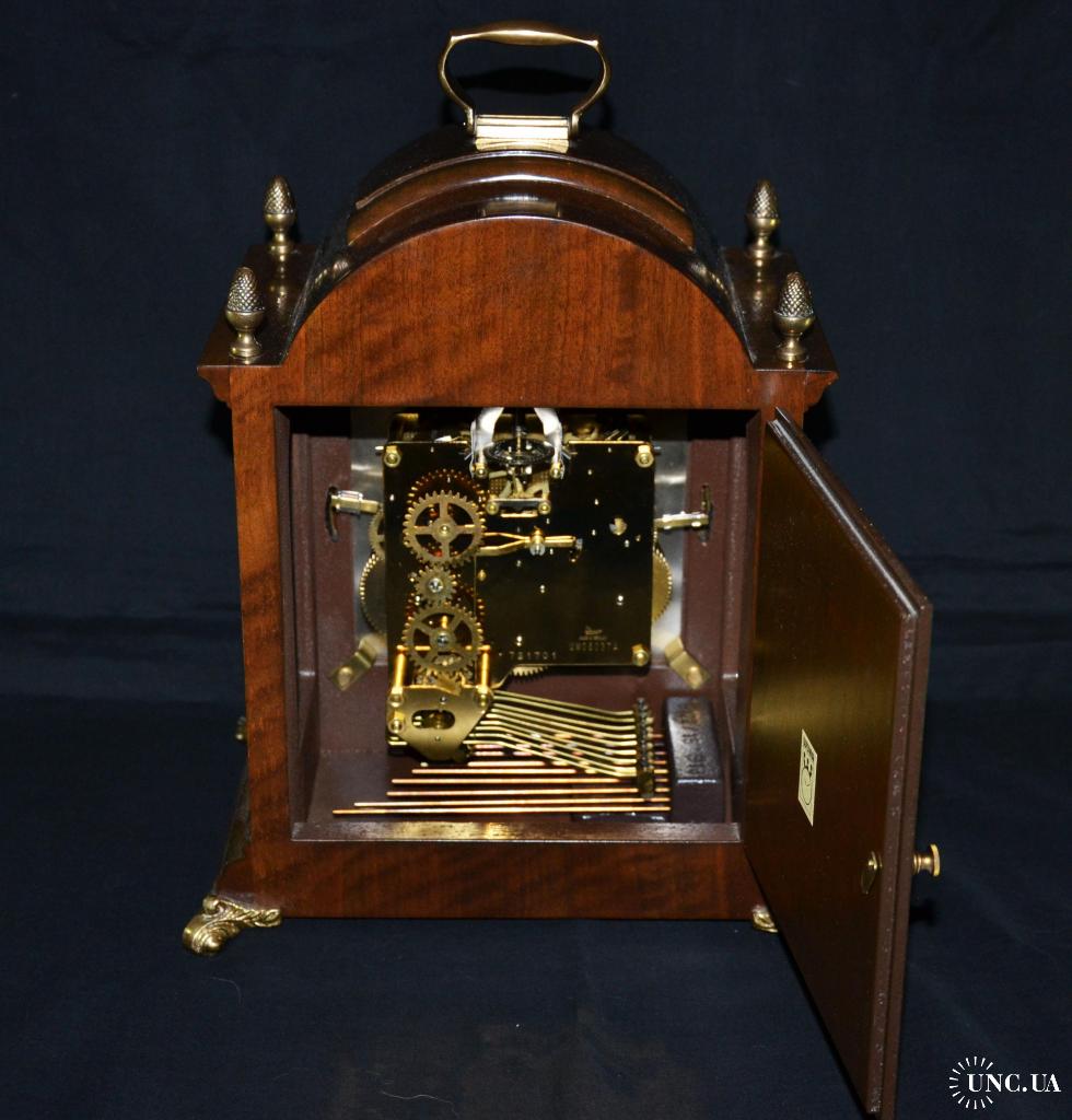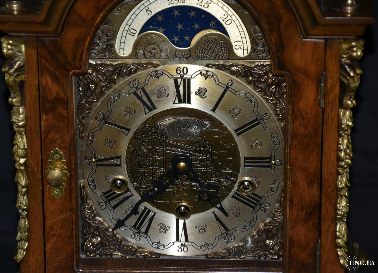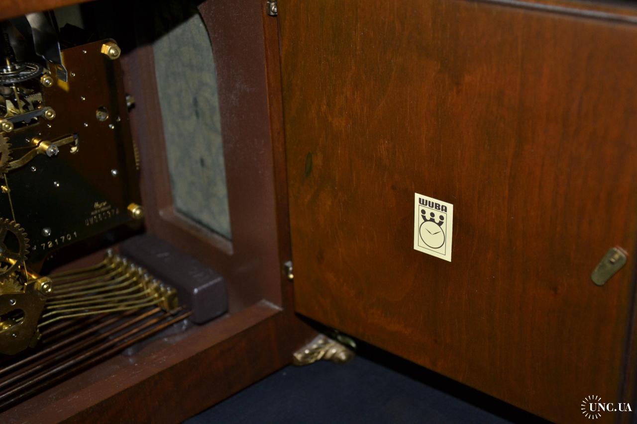 Антикварные кабинетные (каминные, настольные) часы WUBA от Warmink, подзавод на 9 суток, бой каждый полчаса и четверти, массив ореха, бронза, роспись, чеканка, конец 1960-х годов,