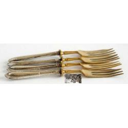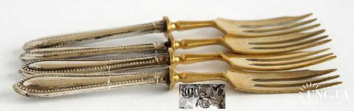 У лоті 4 виделки з позолоченими робочими частинами та срібними грифами 800 проби: довжина кожної – бл. 15,0 см, загальна вага – бл. 84,11 грама;