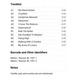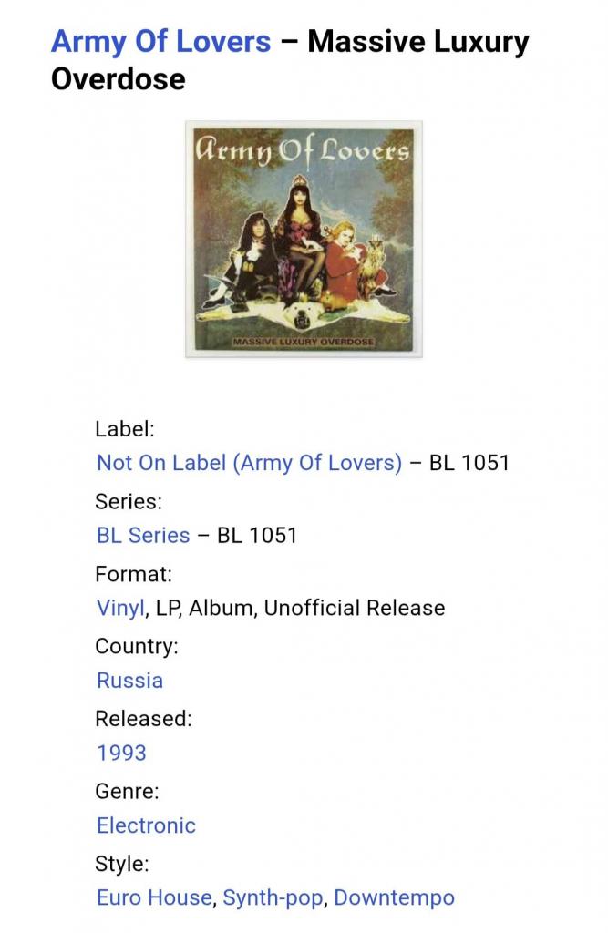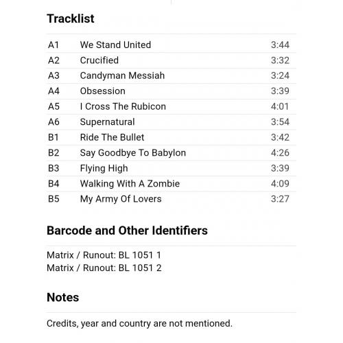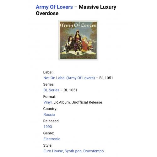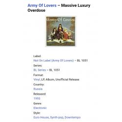 Вінілова платівка. Другий, в дискографії, студійний альбом, Шведської євроденс, поп групи Army Of Lovers, до складу якої, на той час, входили Александр Бард, Жан-П'єр Барда та Ла Камілла (Massive Luxury Overdose) 1991. Неофіційне видання (Unoficcial Release). Випущено невідомою фірмою в росії в 1993-му році. Стан платівки ЕХ+. Конверт ламінований. Стан конверту ЕХ+. Відправка по Україні службами доставки: Нова Пошта, Укр Пошта, Делівері. Також відправляємо посилки за кордон по цілому світу.