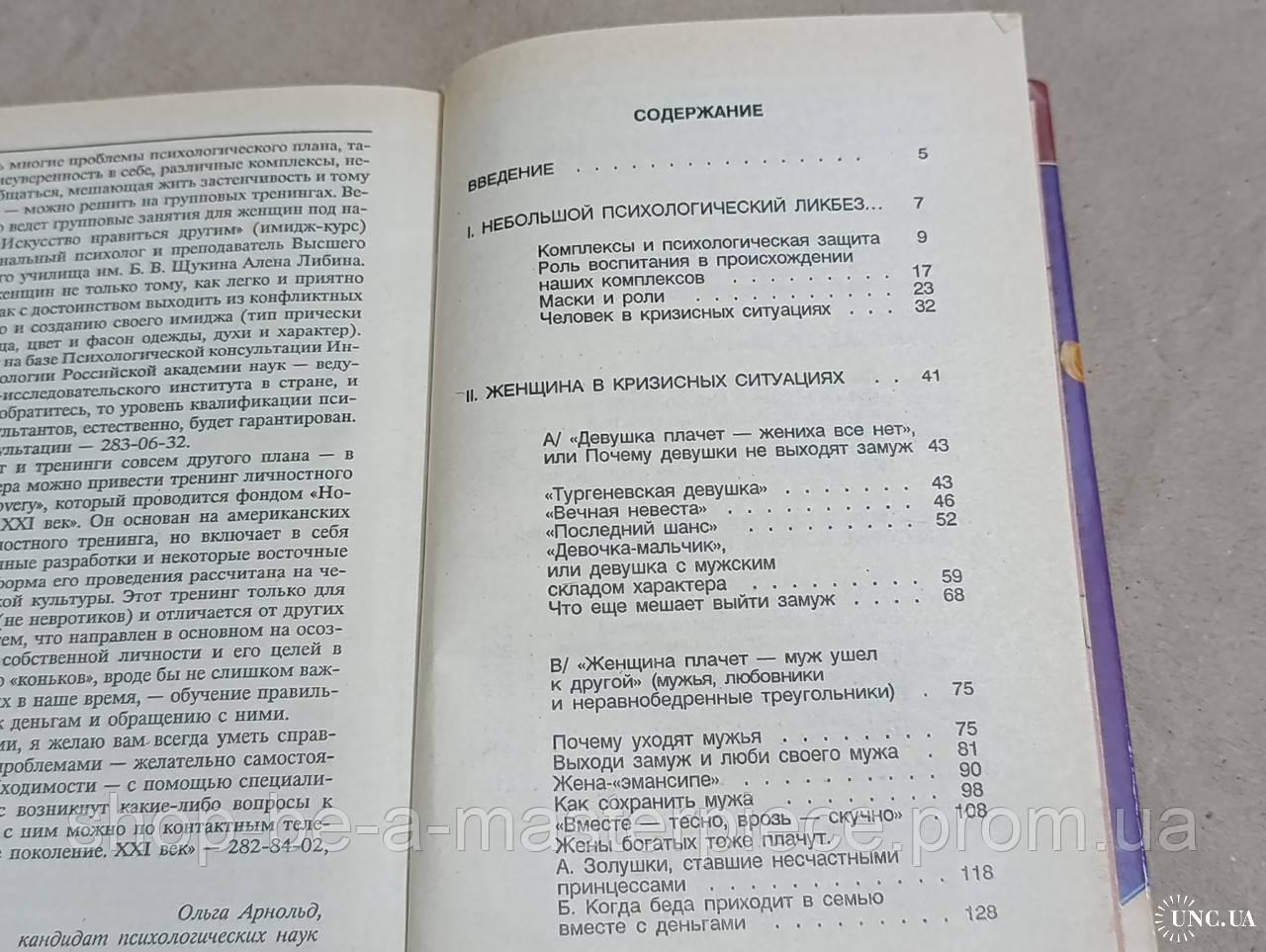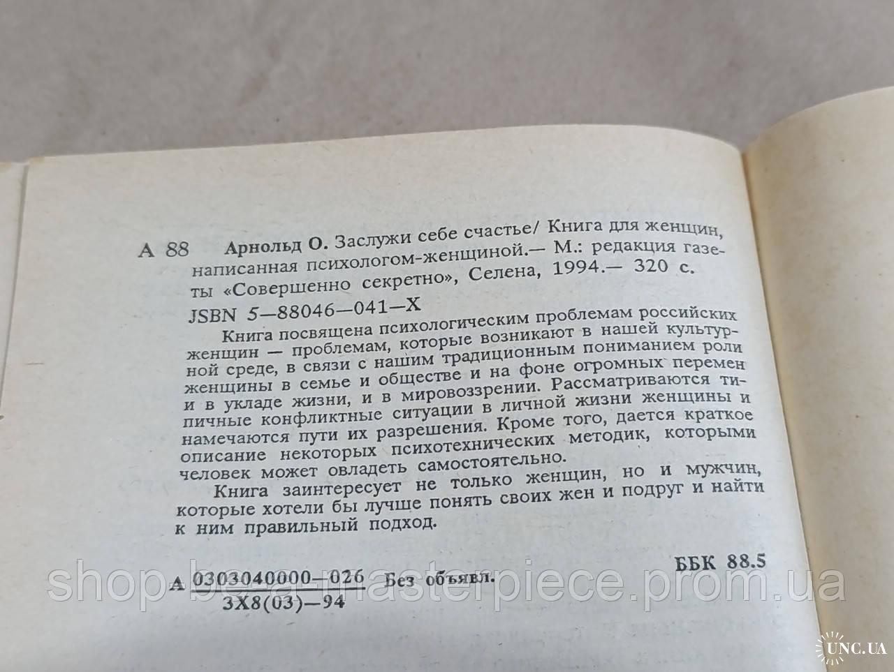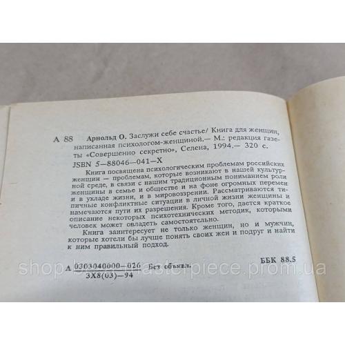 Арнольд Ольга Заслужи себе счастье/ Книга для женщин, написанная психологом-женщиной 1994 Твердая обложка.. состояние отличное М.: редакция газе ты «Совершенно секретно», Селена, 1994. — 320 с. Книга посвящена психологическим проблемам российских женщин проблемам, которые возникают в нашей культур-ной среде, в связи с нашим традиционным пониманием роли женщины в семье и обществе и на фоне огромных перемен и в укладе жизни, и в мировоззрении. Рассматриваются ти-пичные конфликтные ситуации в личной жизни женщины и намечаются пути их разрешения. Кроме того, дается краткое описание некоторых психотехнических методик, которыми человек может овладеть самостоятельно. Книга заинтересует не только женщин, но и мужчин, которые хотели бы лучше понять своих жен и подруг и найти к ним правильный подход.Ответы продавца на ваши вопросы