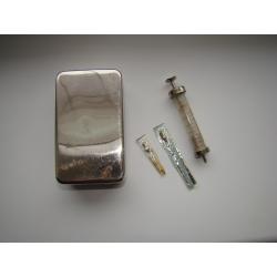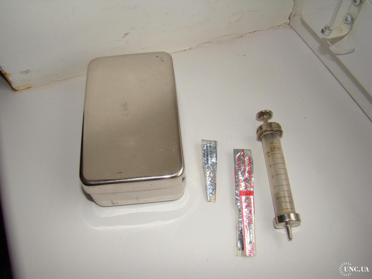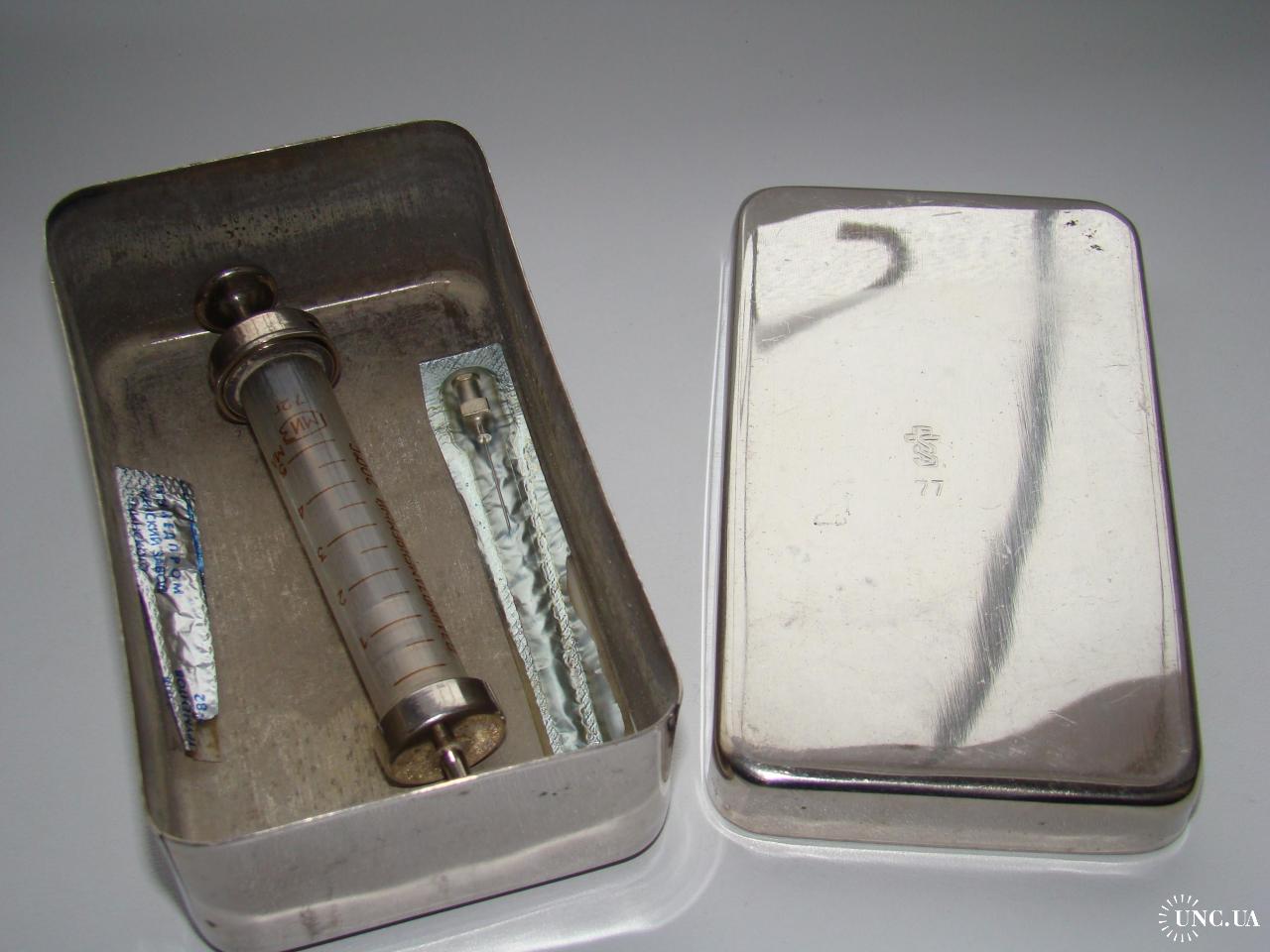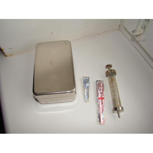 1961-1980Стерилизатор из нержавеющей стали. Размеры: длина 12 см, ширина 7 см, высота 4,5 см. Шприц многоразового использования на 5 мл и две новые запечатавнные иголки. В остальном все как на фото.