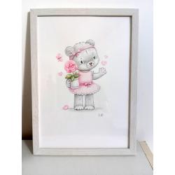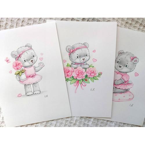 2021-....Авторська акварельна серія картин ′Ведмедик у рожевому′. Акварель, папір А4. 3шт
