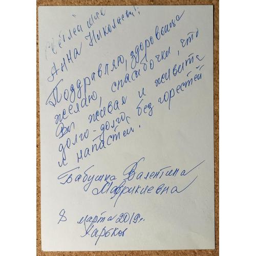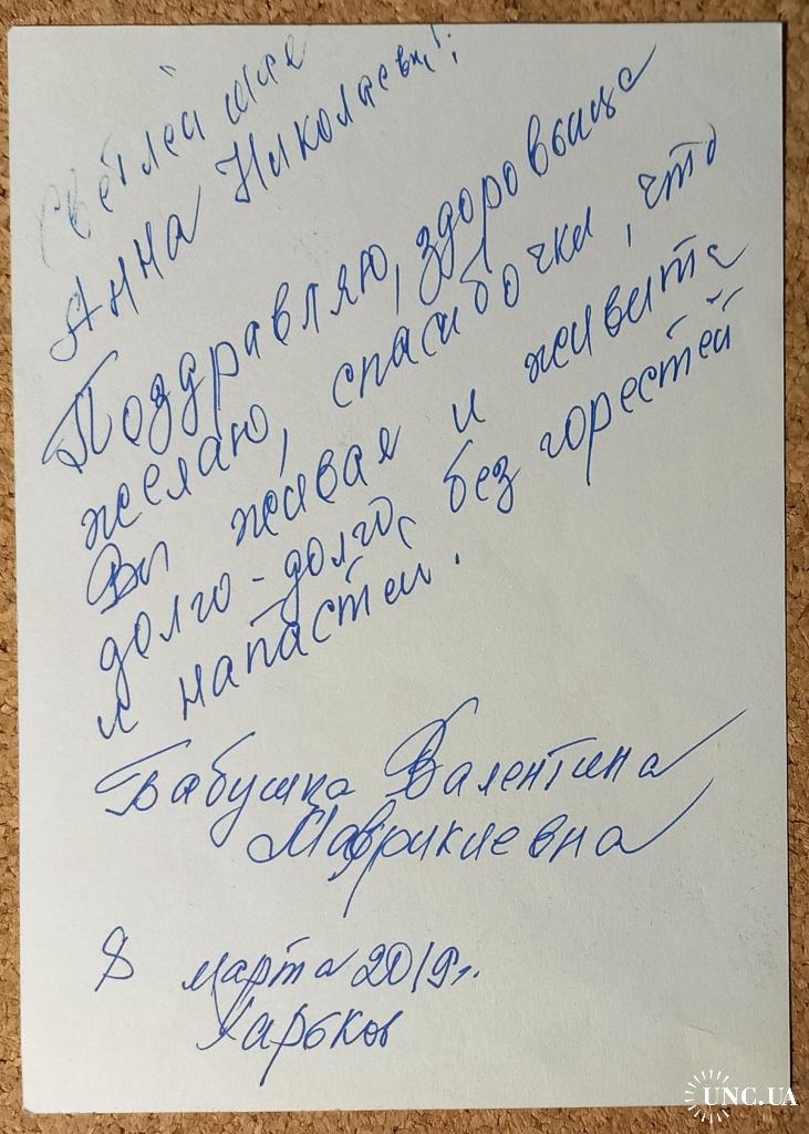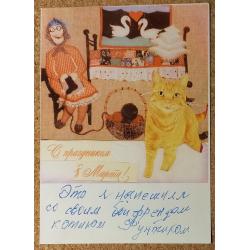 2001-2020Открытка – комикс. На лицевой стороне изображена бабушка с бойфрендом котиком Фунтиком в домашней обстановке и рукописным текстом. На обратной стороне также поздравительный рукописный текст от бабушки Валентины Маврикиевны. Открытка ьбез дефектов. Состояние отличное.