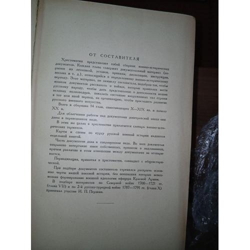 Хрестоматия представляет собой сборник военно-исторических документов. Каждая глава содержит документальный материал (отрывки из летописей, уставов, приказы, диспозиции, инструкции и т.д.), относящийся к определенному военно-историческому периоду. Этот материал, по замыслу составителя, подобран так, чтобы языком документов рассказать о войнах, которые пришлось вести русскому народу, чтобы дать представление о деятельности наших великих полководцев, показать состояние вооруженных сил страны в тот или иной период, их организацию, чтобы проследить развитие русского военного искусства. Всего в сборнике 14 глав, охвытывающих X - XIX вв и начало XX в. Документы допетровской эпохи даны в переведенном виде.