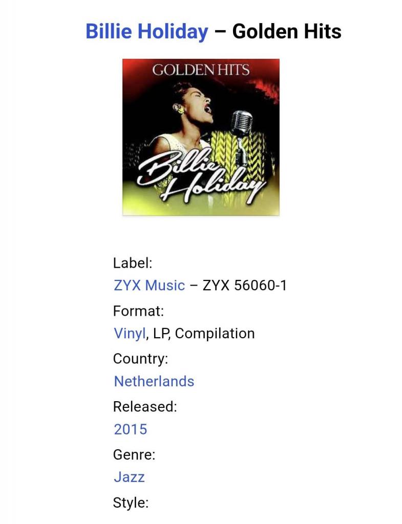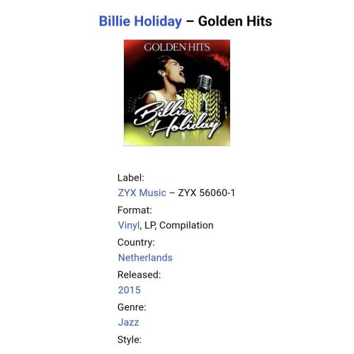 1941-1960Вінілова платівка. Збірка золотих хітів Афроамериканської джазової вокалістки, покійної вже, Елеонори Феган, більше відомої під сценічним ім,ям Біллі Холідей (Golden Hits) 1933-59. Випуск фірми (Zyx Music) Netherlands 2015-ий рік. Видання нове, запаковане. Категорія S/S. Відправка по Україні службами доставки: Нова Пошта, Укр Пошта, Делівері. Також відправляємо посилки за кордон по цілому світу.