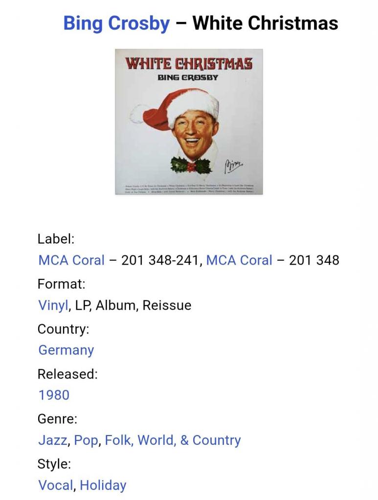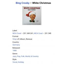 1941-1960Вінілова платівка. Різдвяний, студійний альбом, легендарного Американського кіноактора та музичного виконавця із Вашингтона, Бінга Кросбі (White Christmas) 1942. Випуск фірми (MCA Coral / World Music) Germany, 1980-ий рік. Оригінальне, Німецьке видання. Стан платівки EX+. Конверт глянцевий. Стан конверту ЕХ+. Відправка по Україні службами доставки: Нова Пошта, Укр Пошта, Делівері. Також відправляємо посилки за кордон по цілому світу.