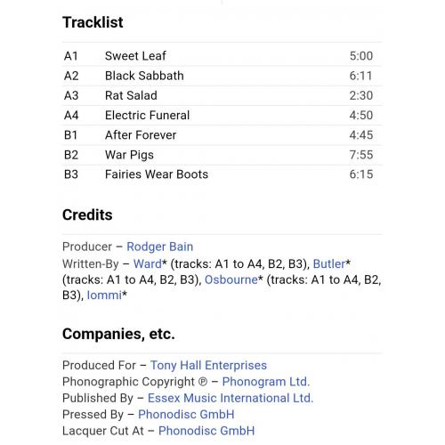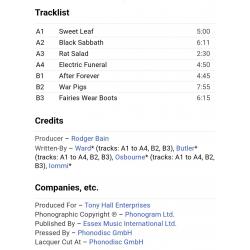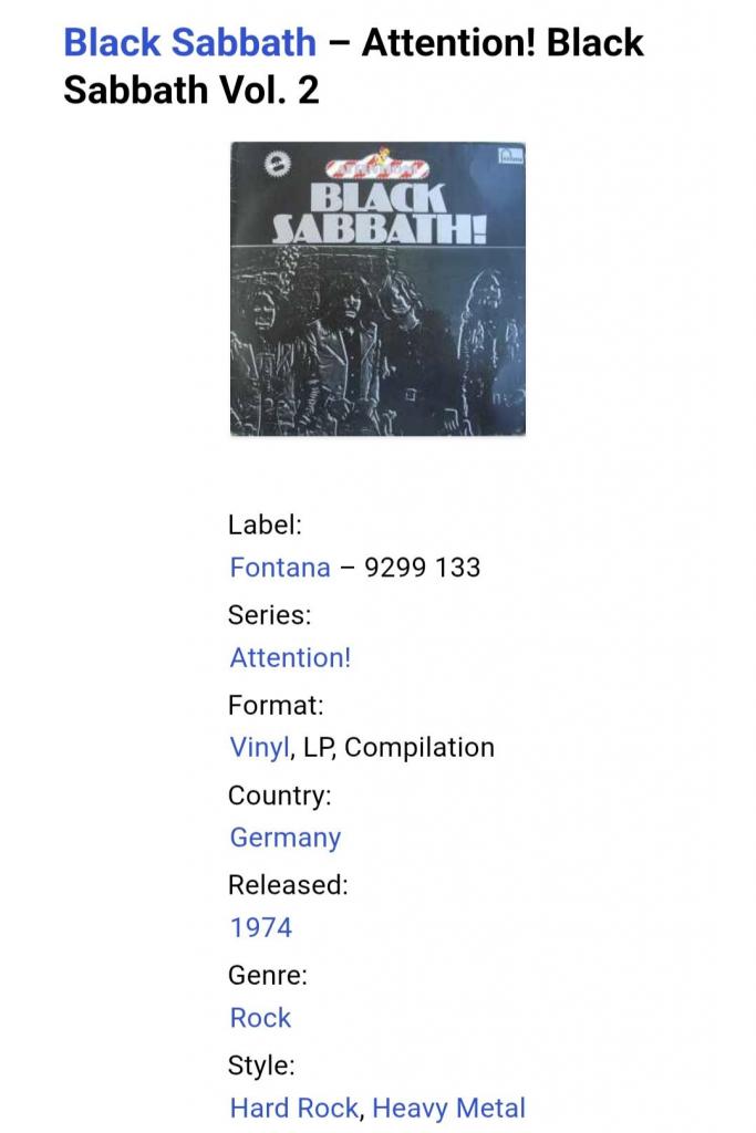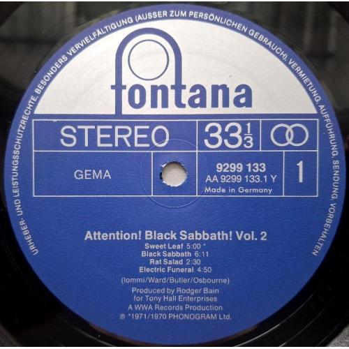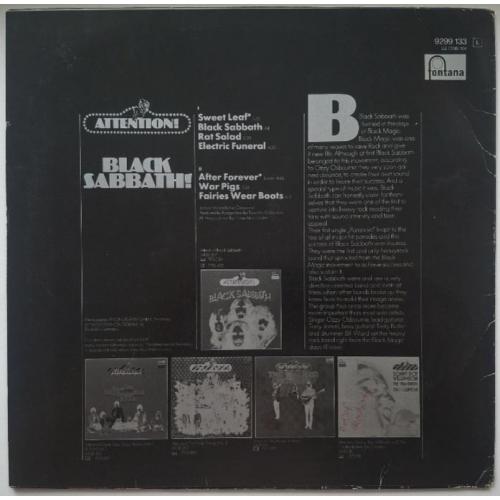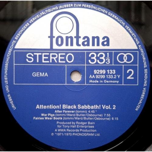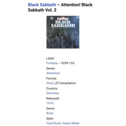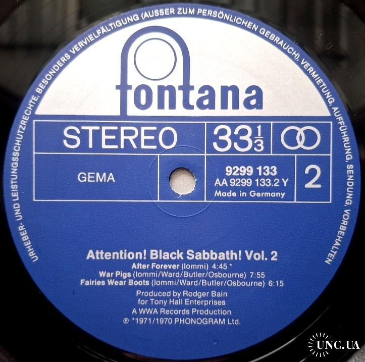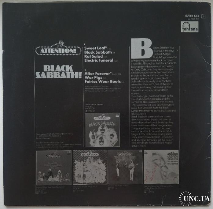 Вінілова платівка. Збірка ранніх хітів, Британської хард-рок, хеві метал, дум метал групи з міста Бірмінгема, Black Sabbath, яка складалась на той час з учасників Оззі Озборна, Тоні Айоммі, Гізера Батлера та Білла Ворда (Attention! Vol-2) 1970-71. Випуск фірми (Fontana) Germany, 1974-ий рік. Оригінальне, Німецьке видання. Стан платівки ЕХ+. Стан конвертів ЕХ-. Відправка по Україні службами доставки: Нова Пошта, Укр Пошта, Делівері. Також відправляємо посилки за кордон по цілому світу.