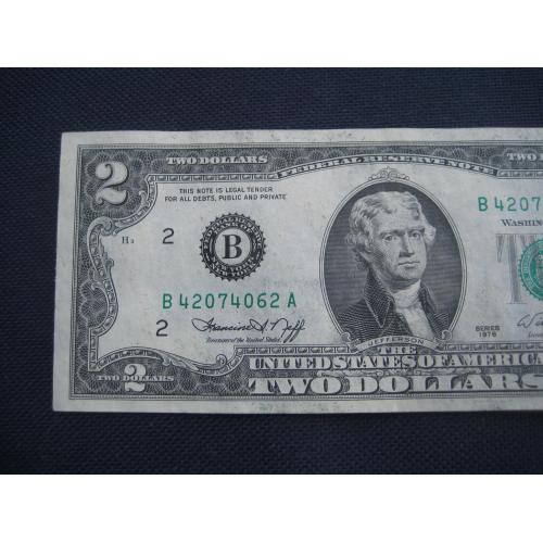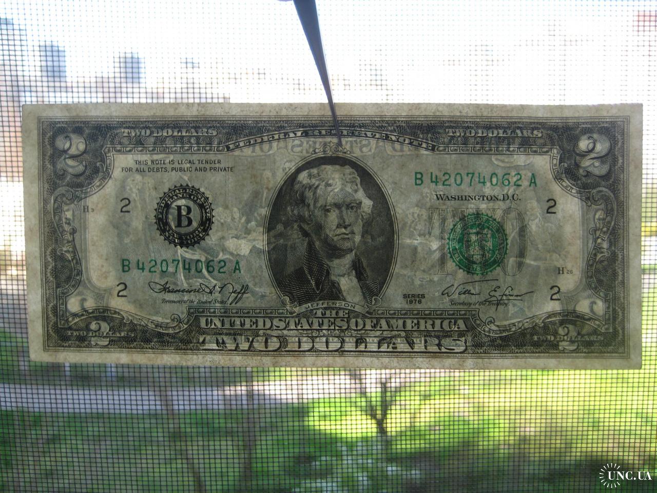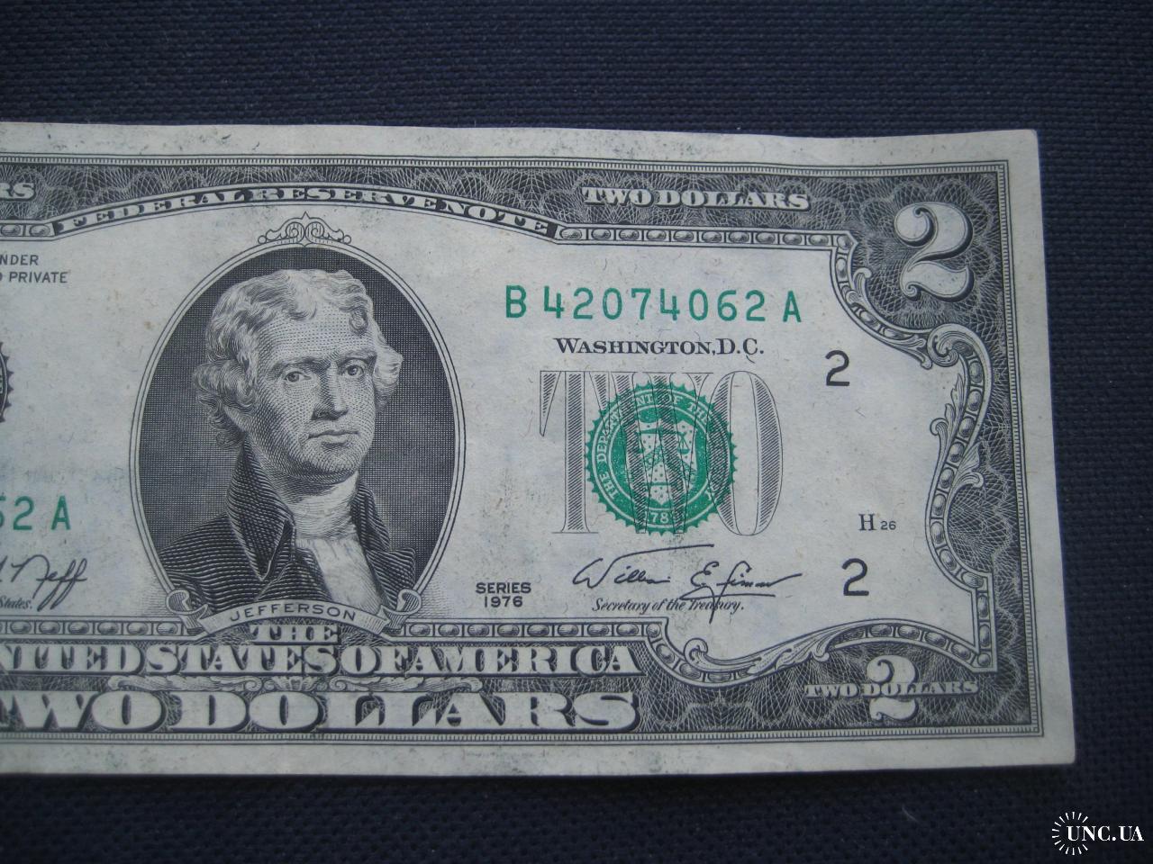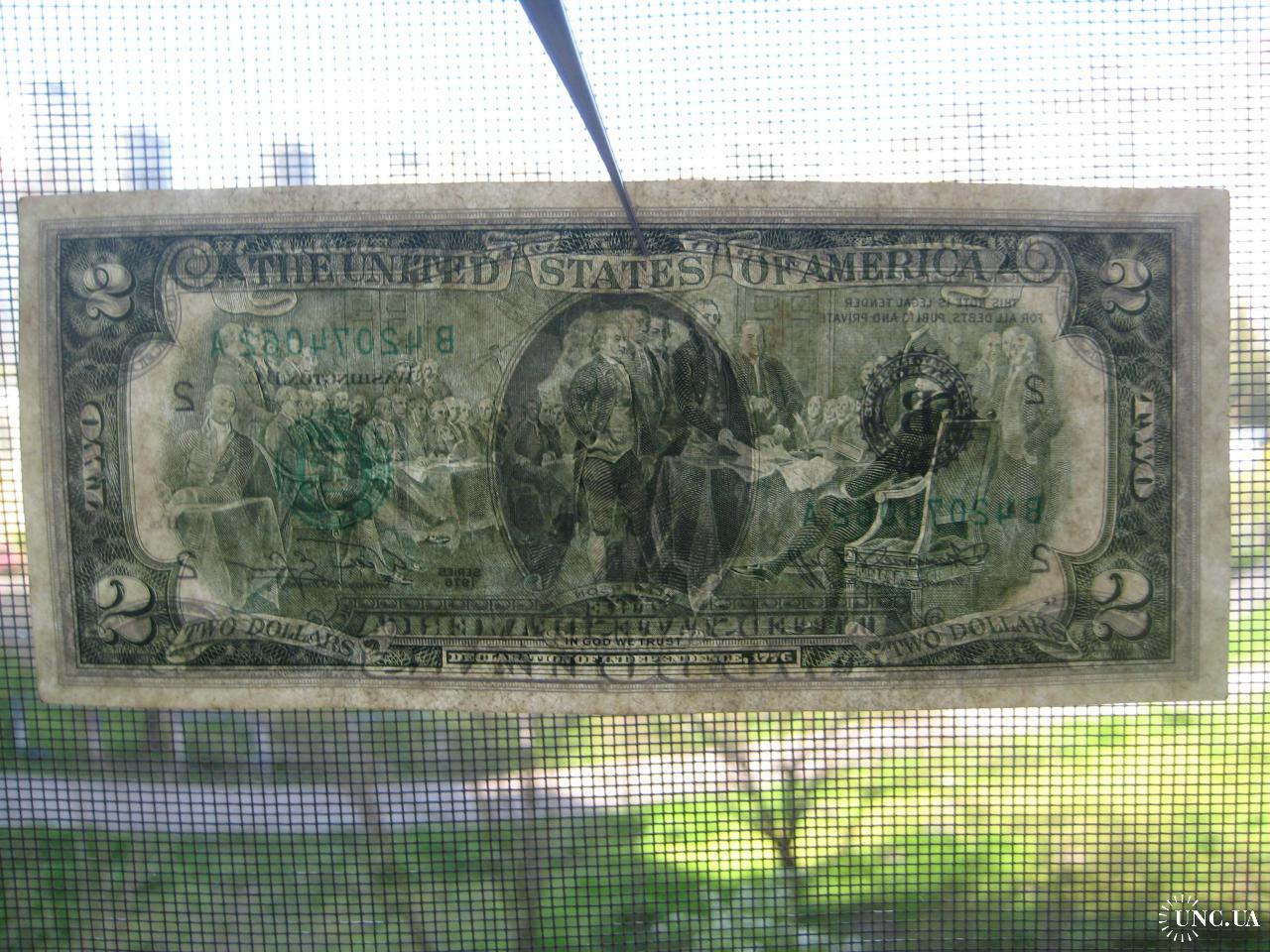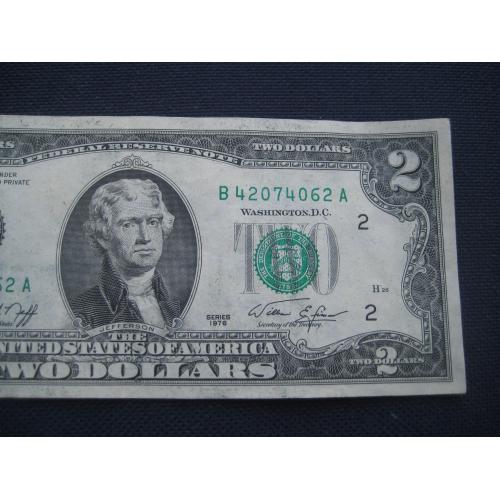 №638. Оригінальна бона - два долара США 1976 (В 42074062 А). Стан прошу оцінювати по фото. Розмір:6,6х15,6см. Пересилка - Нова пошта, Укрпошта. Для киян можливість зустрічі та перегляду (неділя метро Нивки). В РФ и Белоруссию не отправляю!