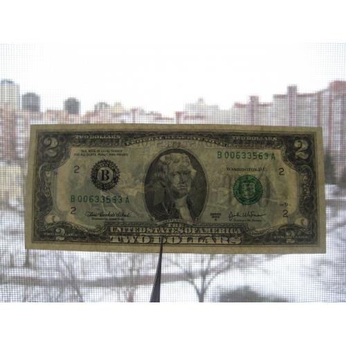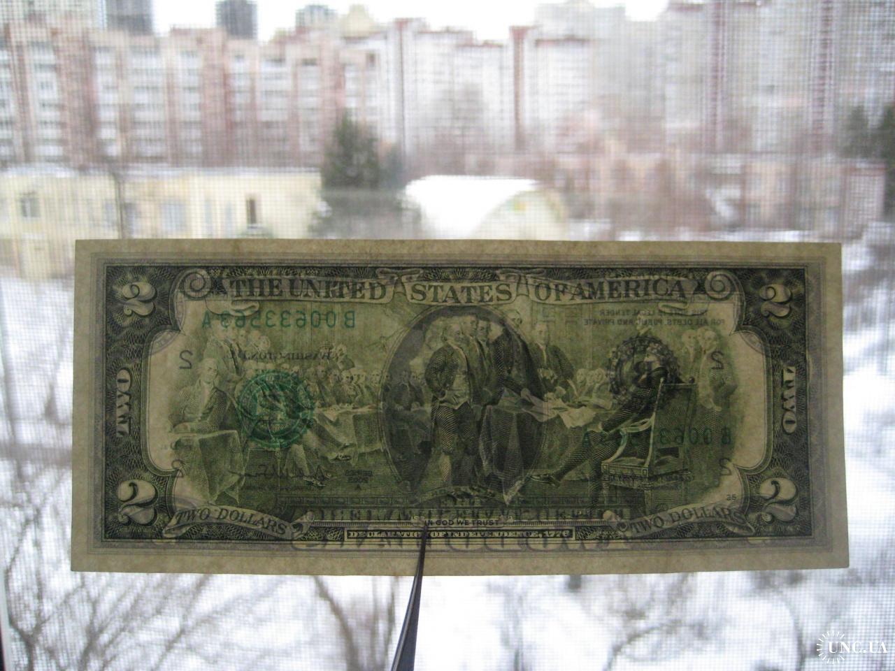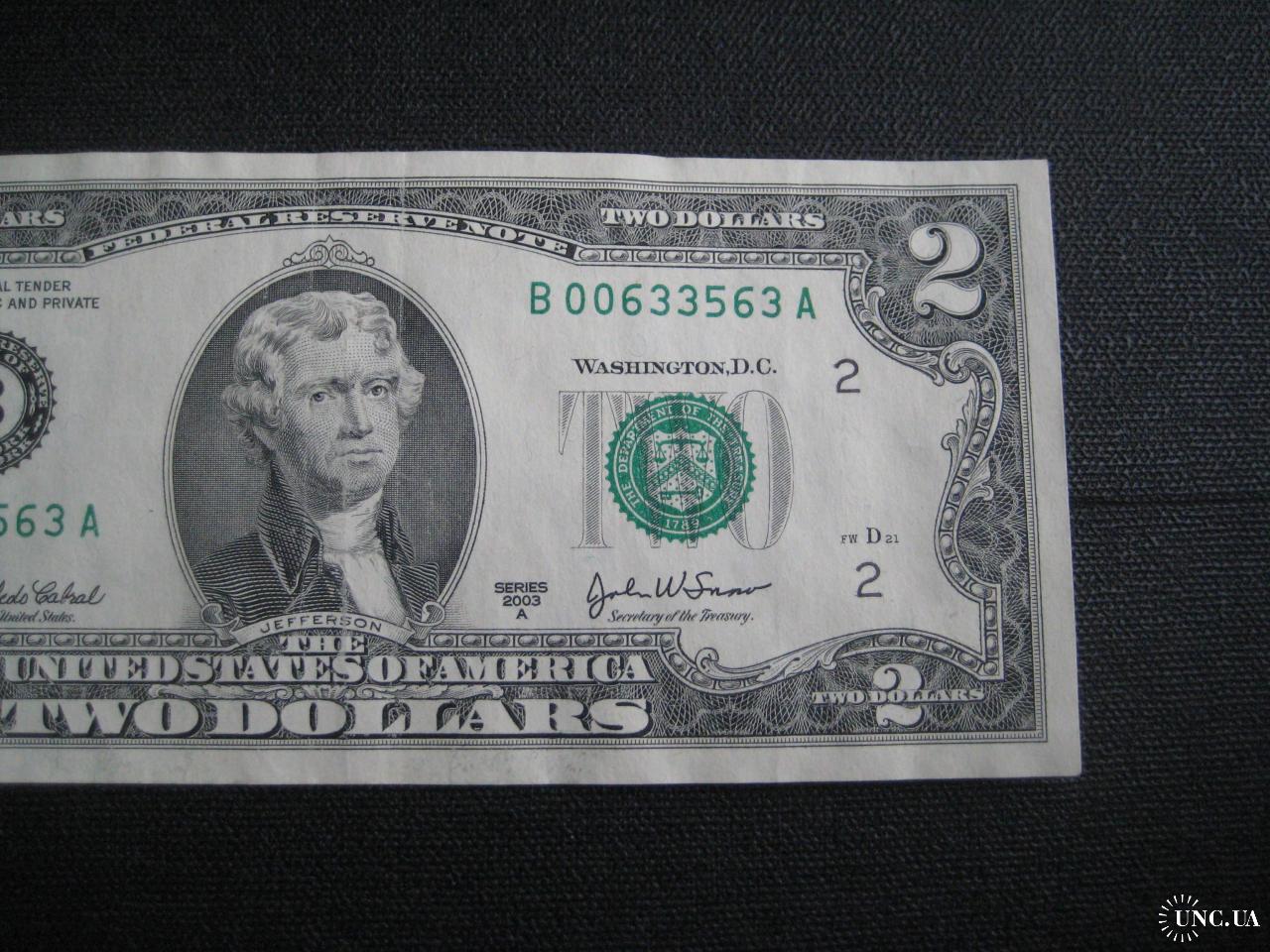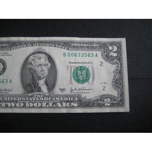 №847. Оригінальна бона - два долара США 2003 (В 00633563 A). Стан прошу оцінювати по фото. Розмір:6,6х15,7см. Пересилка - Нова пошта, Укрпошта. Для киян можливість зустрічі та перегляду (неділя метро Нивки). В РФ и Белоруссию не отправляю!