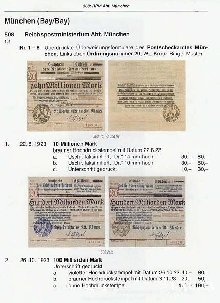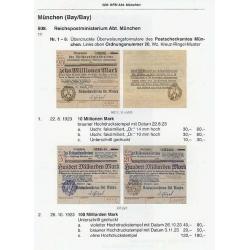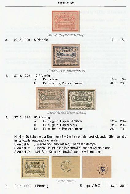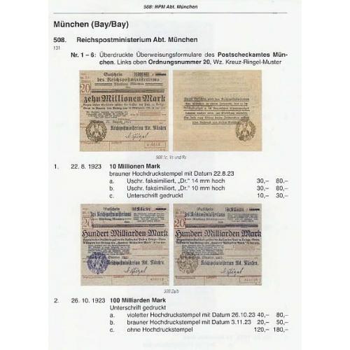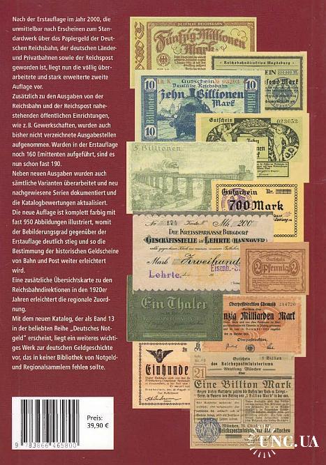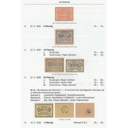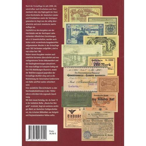 Денежные знаки чрезвычайных обстоятельств (нотгельды) - выпущенных Министерством транспорта Рейха, управлением Reichsbahn и подчиненными ему отделениями, от государственных и частных железных дорог и Рейхспочты. Цветные качественные иллюстрации. Цены в евро.