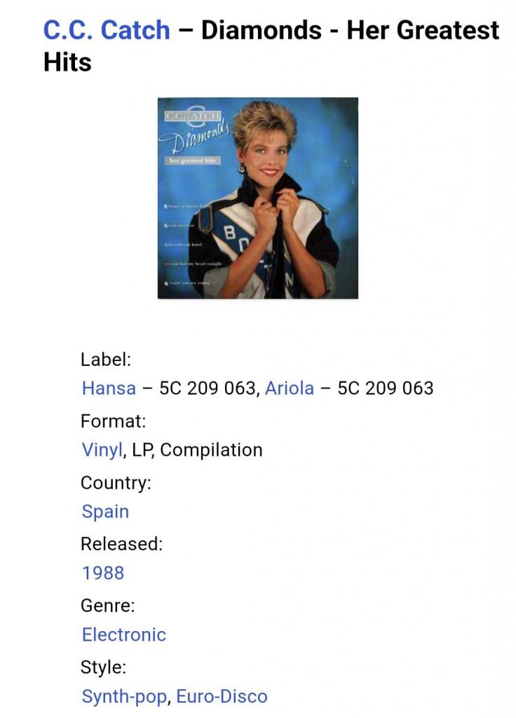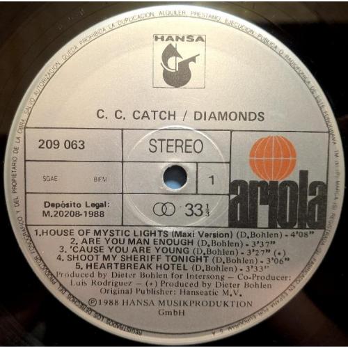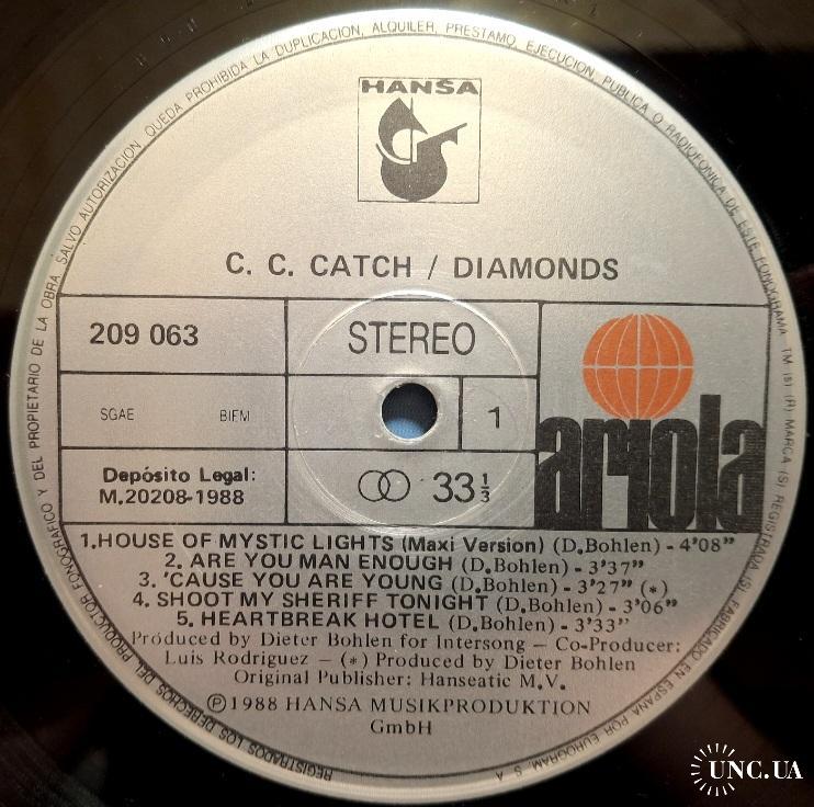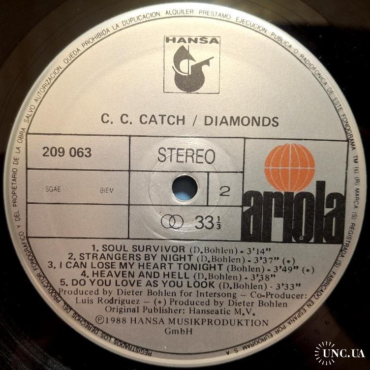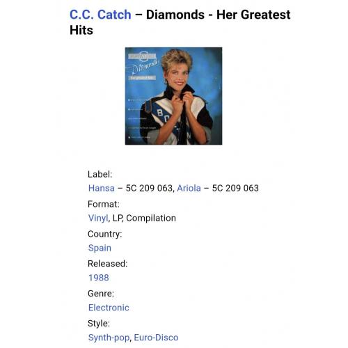 Вінілова платівка. Перша, офіційна збірка найкращих хітів золотого періоду, легендарної Німецької виконавиці Голландського походження, стилю Євро Диско, Кароліни Катерини Мюллер, більше відомої під сценічним ім,ям C.C. Catch (Diamonds. Her Greatest Hits) 1986-88. Випуск фірми (Ariola / Hansa) Spain, 1988-ий рік. Оригінальне, першопресове Іспанське видання. Стан платівки VG+. Конверт глянцевий. Стан конверту VG+. Відправка по Україні службами доставки: Нова Пошта, Укр Пошта, Делівері. Також відправляємо посилки за кордон по цілому світу.