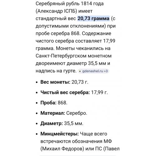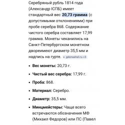 Оригинал☝️Царская монета 1рубль 1814г. (серебро 868пр.) Александр 1.Состояние отличное,без реставраций,монета не шлифованая и не чищенная.Оригинал, гарантия подлинности пожизненная!☝️Доставка НП наложным платежом при небольшой предоплате 150гр (страховка доставки) остальная сумма доплачивается при получении.