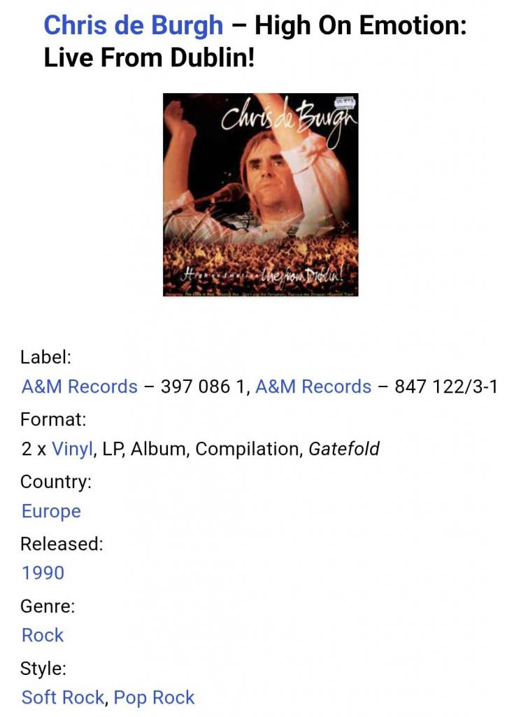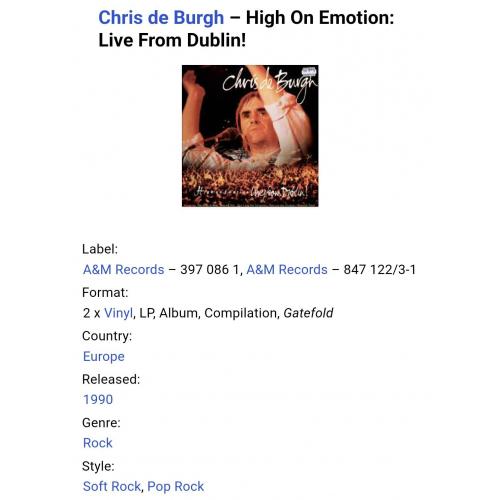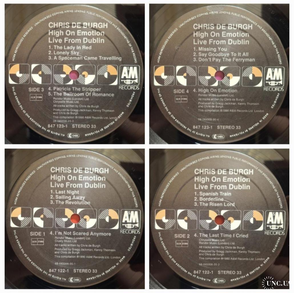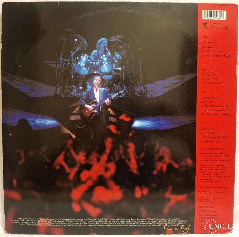 Вінілові платівки. Живий виступ. Концертний альбом Британсько-Ірландського поп-рок виконавця, Аргентинського походження, Крістофера Джона Девісіона Бурга, більше відомого під скороченим сценічним ім'ям Кріс Де Бург (High On Emotion: Live From Dublin) 1990. Випуск фірми (A&M Records) Holland, 1990-ий рік. Оригінальне, першопресове Голландське видання з двох платівок (2LP). Стан платівок ЕХ+. Конверт розворотний (Gatefold). Стан конверту ЕХ+. В комплекті внутріші вставки (Ois). Відправка по Україні службами доставки: Нова Пошта, Укр Пошта, Делівері. Також відправляємо посилки за кордон по цілому світу.