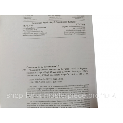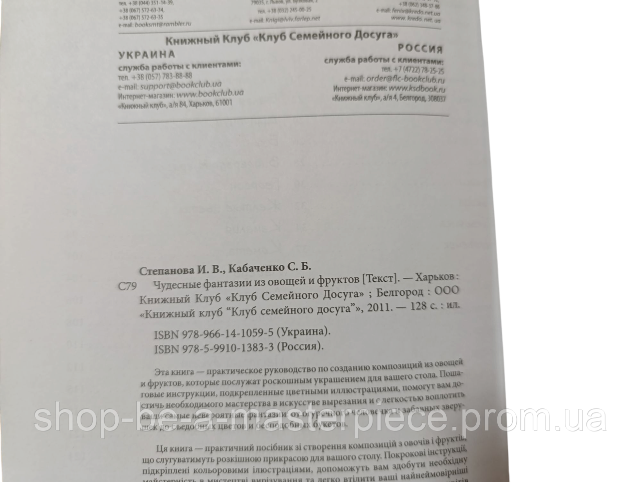 Чудесные фантазии из овощей и фруктов Сергей Кабаченко, Ирина Викторовна Степанова 2011 Количество страниц: 128 стр. цветные иллюстрации Формат: 70x100/16 (170x240 мм) Переплет: Твердая Язык: русский Состояние новойОтветы продавца на ваши вопросы