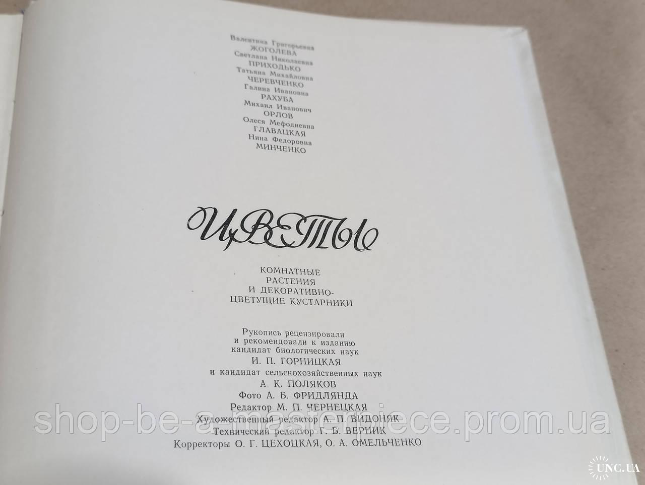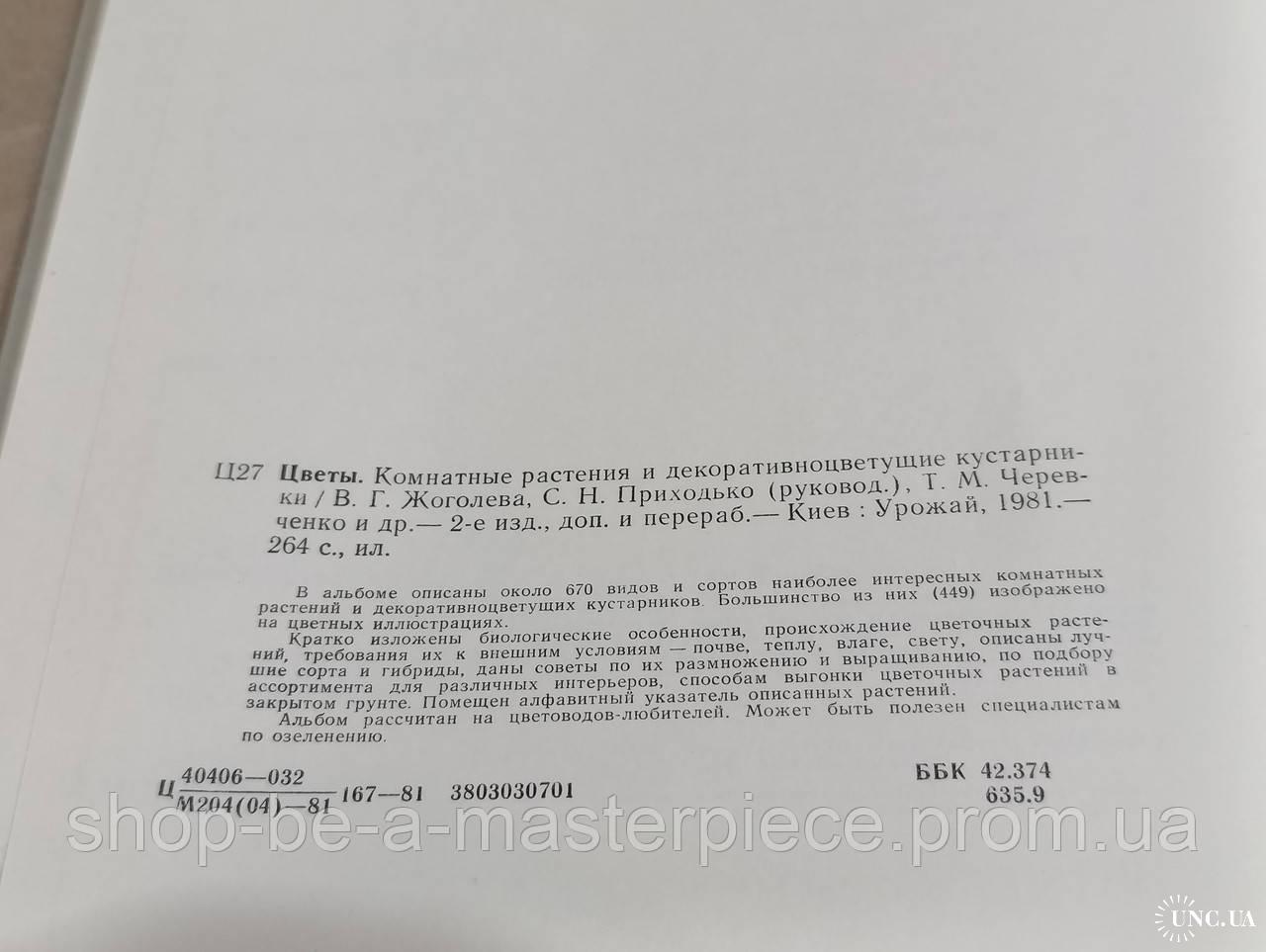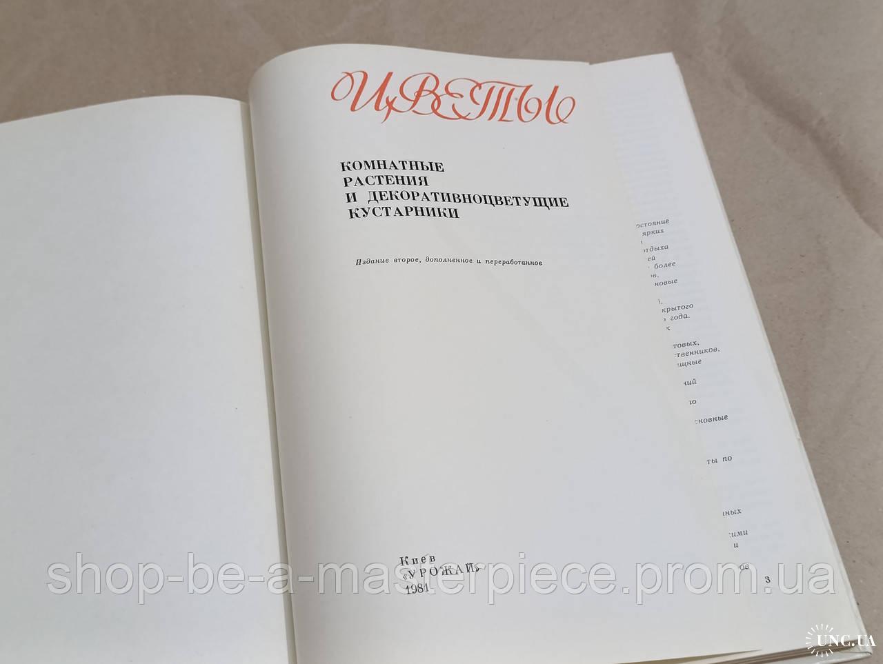 Цветы. Комнатные растения и декоративноцветущие кустарники В. Г. Жоголева, С. Н. Приходько Т. М. Черевченко 1981 Твердый глянцевый переплет Идеальное состояние. Есть небольшой штамп на внутренней стороне обложки 2-е изд., доп. и перераб. — Киев: Урожай, 1981. -264 с., ил. В альбоме описаны около 670 видов и сортов наиболее интересных комнатных растений и декоративноцветущих кустарников. Большинство из них (449) изображено на цветных иллюстрациях. Кратко изложены биологические особенности, происхождение цветочных расте ний, требования их к внешним условиям почве, теплу, влаге, свету, описаны лучшие сорта и гибриды, даны советы по их размножению и выращиванию, по подбору ассортимента для различных интерьеров, способам выгонки цветочных растений в закрытом грунте. Помещен алфавитный указатель описанных растений. Альбом рассчитан на цветоводов-любителей. Может быть полезен специалистам по озеленению.Ответы продавца на ваши вопросы