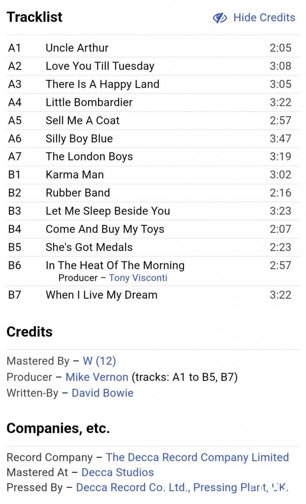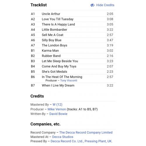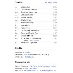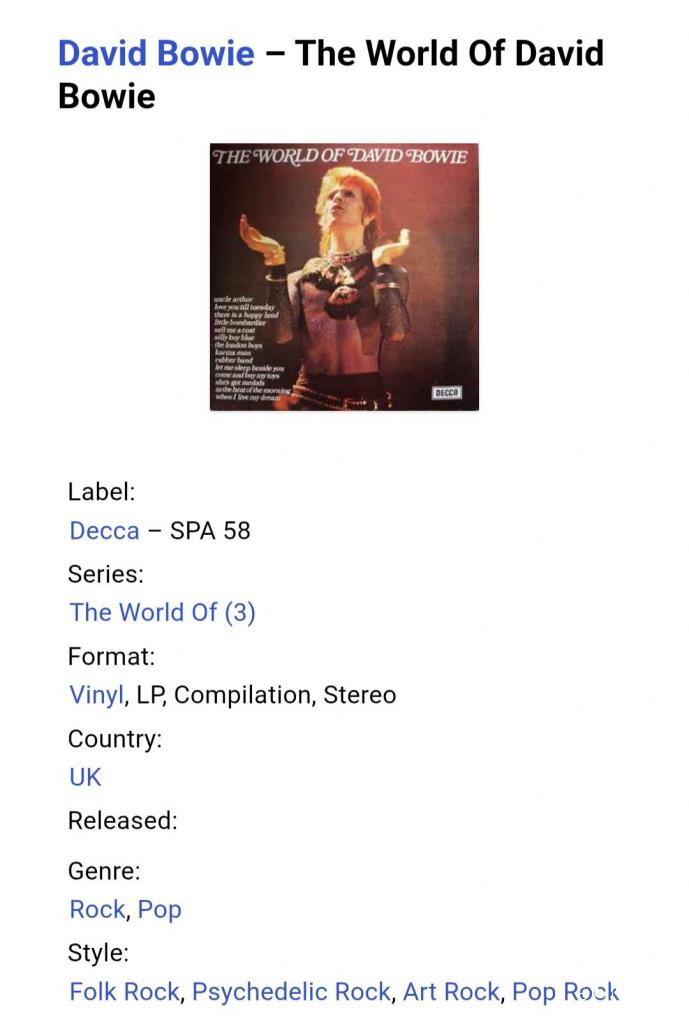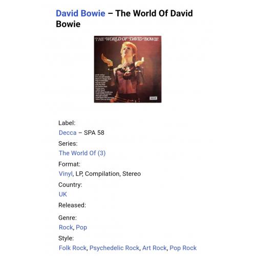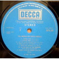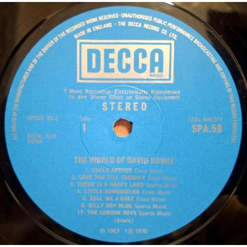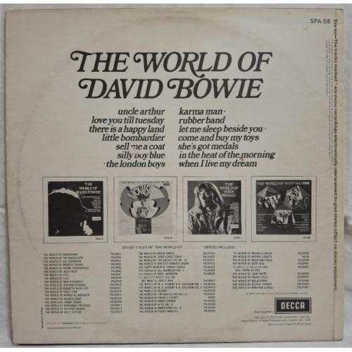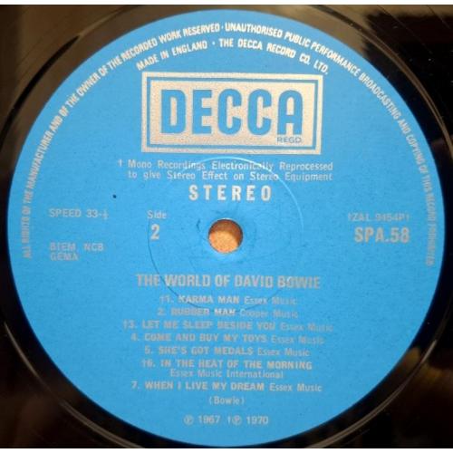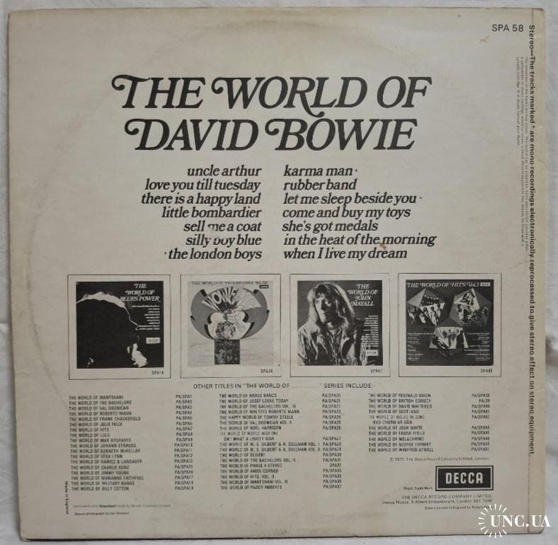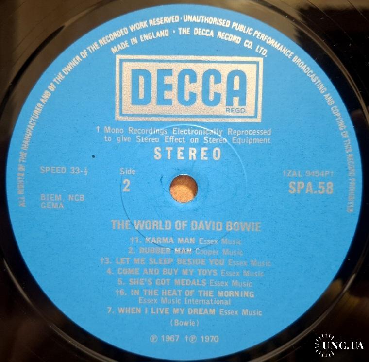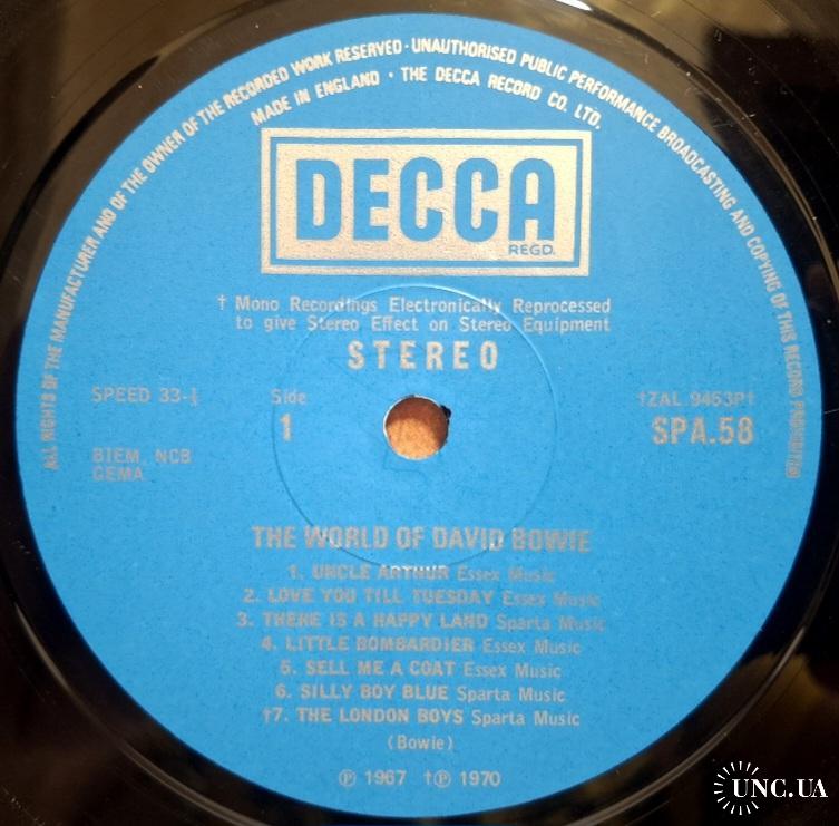 Вінілова платівка. Перша, в дискографії, офіційна студійна збірка найкращих хітів, Британського глем-рок, поп-рок, хард-рок музиканта, володара титулів зірки алеї слави, Ордена Британської Імперії, Ордена мистецтва та літератури, покійного вже, Девіда Роберта Джонса, більше відомого під сценічним ім'ям Девід Боуі (The World Of David Bowie) 1967-70. Випуск фірми (Decca) England, 1970-ий рік. Оригінальне, Британське видання. Стан платівки ЕХ-. Конверт ламінований. Стан конверту ЕХ. Відправка по Україні службами доставки: Нова Пошта, Укр Пошта, Делівері. Також відправляємо посилки за кордон по цілому світу.
