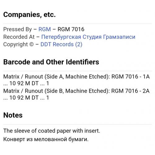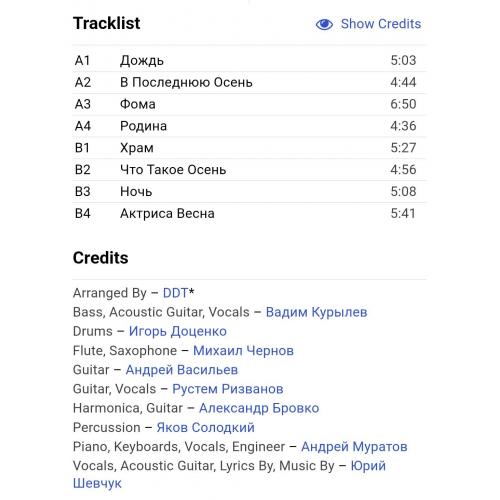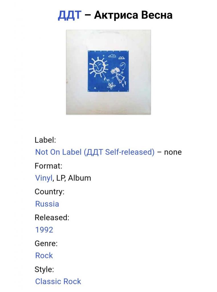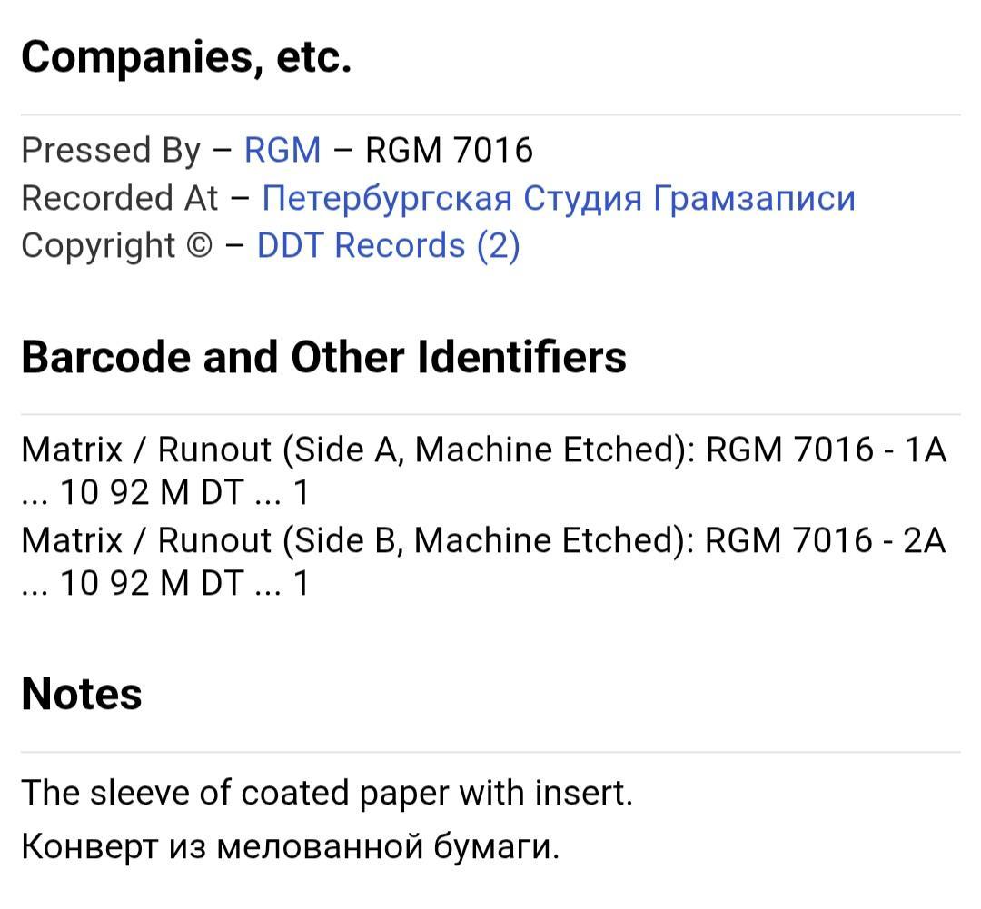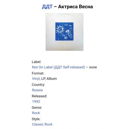 Вінілова платівка. Дев,ятий, в дискографії, і самий хітовий, студійний, альбом російської (радянської) ррк-групи з Уфи, ДДТ, яка складалася на той час з Юрія Шевчука, Вадима Курильова, Ігоря Доценко, Михайла Чернова, Андрія Васильєва, Рустема Ризванова, Олександра Бровко, Якова Солодкого та Андрія Муратова (Актриса Весна) 1992. Випущено ДДТ Self Released, Russia 1992-ий рік. Оригінальне, першопресове видання. Рідкісне (Rare). Стан платівки VG+. Стан конверту EX-. Відправка по Україні службами доставки: Нова Пошта, Укр Пошта, Делівері. Також відправляємо посилки за кордон по цілому світу.
