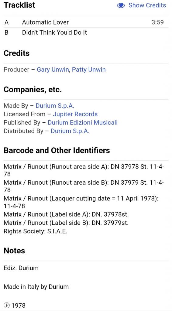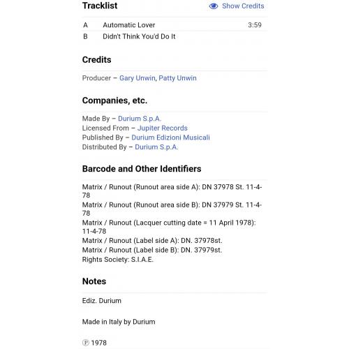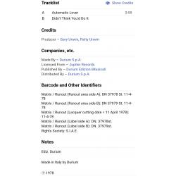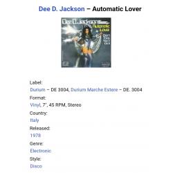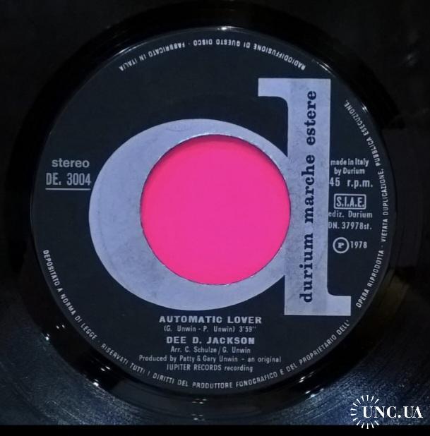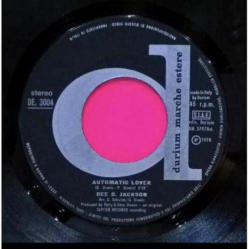 1961-1980Вінілова платівка. Другий, в дискографії, студійний міні сингл (ЕР 7), Британської композиторки та диско поп виконавиці з Оскфорда, Dee D. Jackson (Automatic Lover) 1978. Випуск фірми (Durium Marche Estere) Italia, 1978-ий рік. Оригінальне, першопресове Італійське видання. Стан платівки ЕХ+. Стан конверту NM-. Відправка по Україні службами доставки: Нова Пошта, Укр Пошта, Делівері. Також відправляємо посилки за кордон по цілому світу.