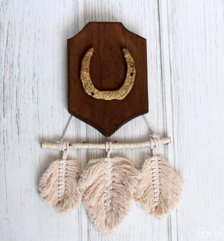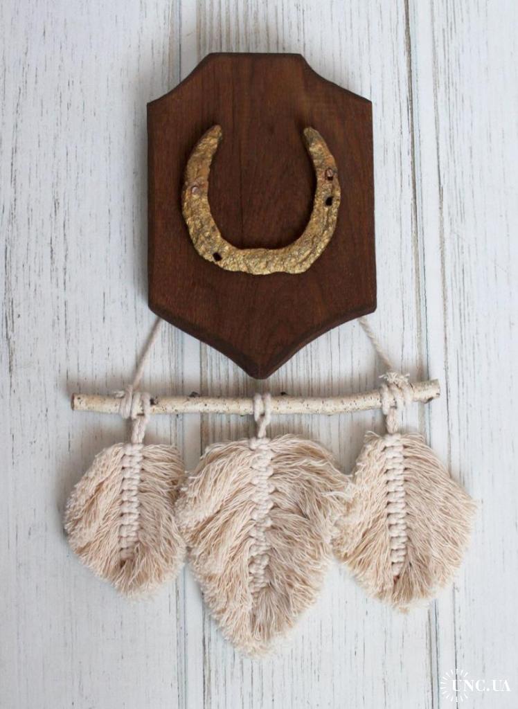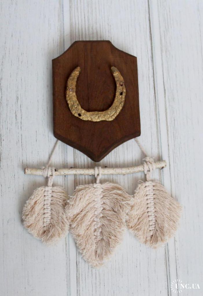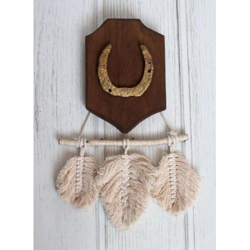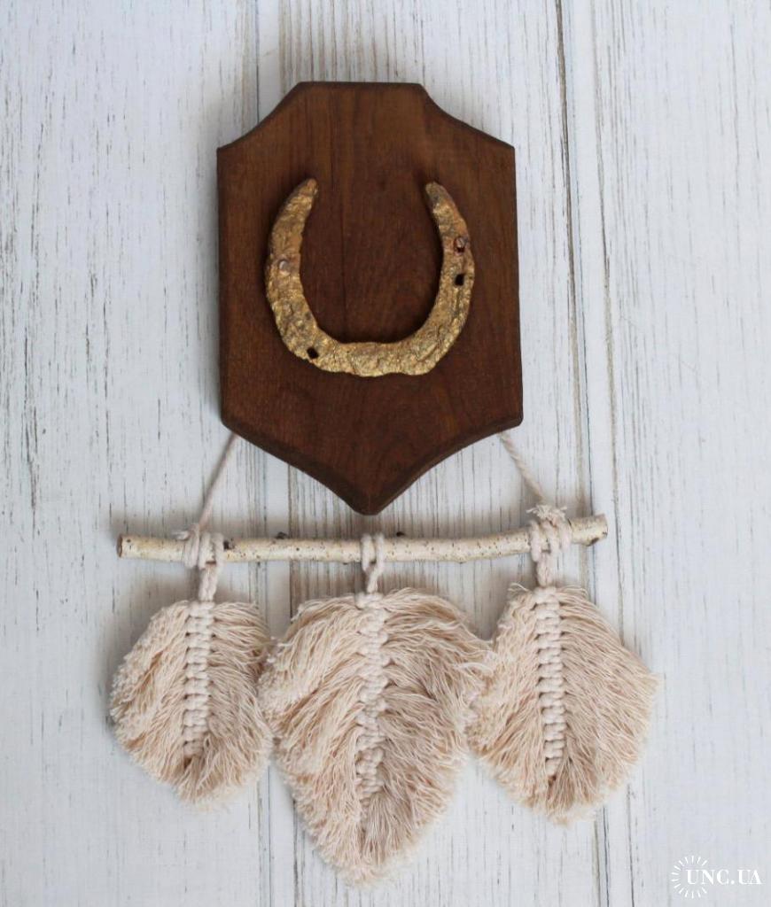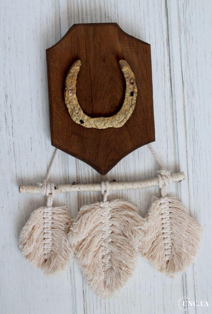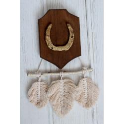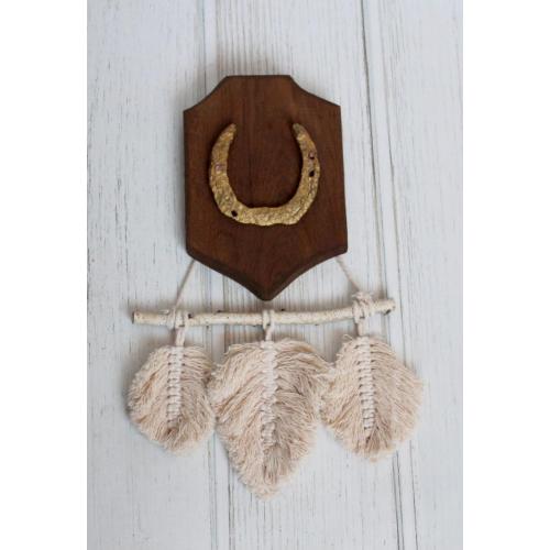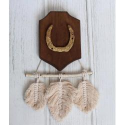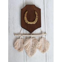Декоративна підкова на дубовій основі (ручна робота) з гірляндою макраме "листочки"