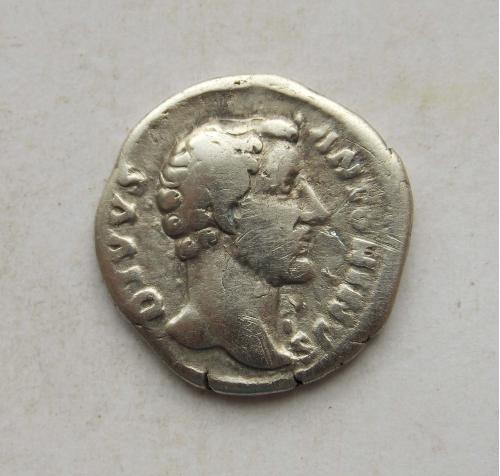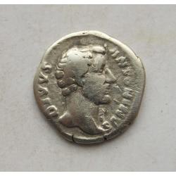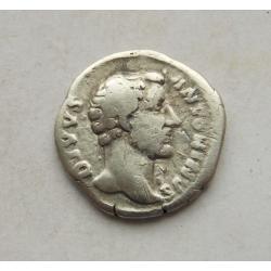 АВЕРС: DIVVS ANTONINVS — голова Антоніна Пія без вінка, повернена вправо; довга шия, бюст.