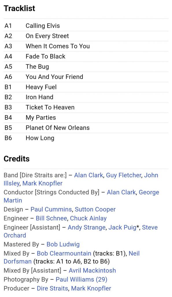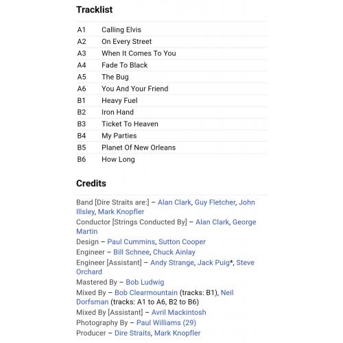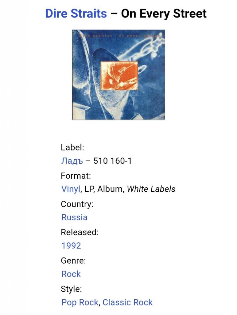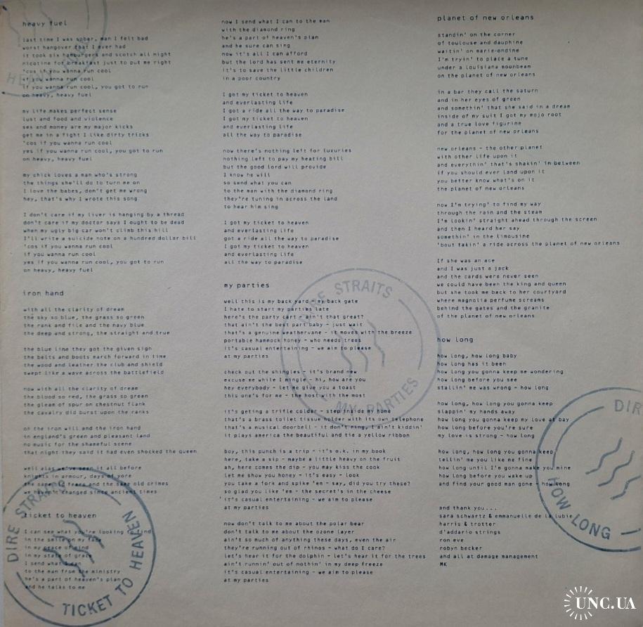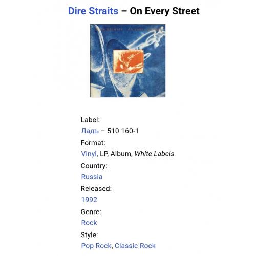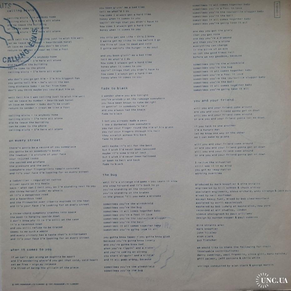 Вінілова платівка. Шостий, в дискографії, студійний альбом, Британської кантрі-рок, прог-рок, паб-рок групи із Ньюкасла, Dire Straits, до складу якої, на той час, входили учасники Марк Нопфлер, Джон Ілслі, Алан Кларк та Гей Флетчер (On Every Street) 1991. Випуск фірми (Ладь) Russia, 1992-ий рік. Стан платівки NM-. Стан конверту NM-/EX+. В комплекті внутрішня вставка. Відправка по Україні службами доставки: Нова Пошта, Укр Пошта, Делівері. Також відправляємо посилки за кордон по цілому світу.