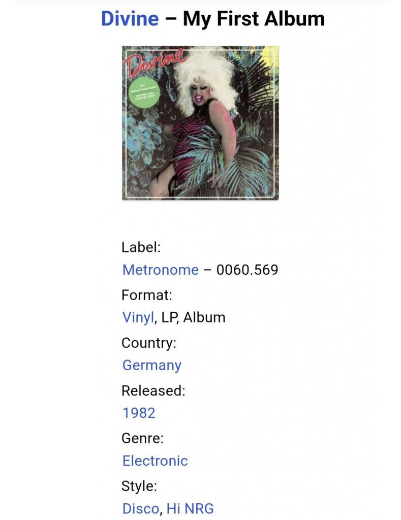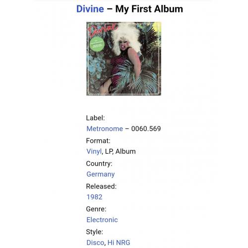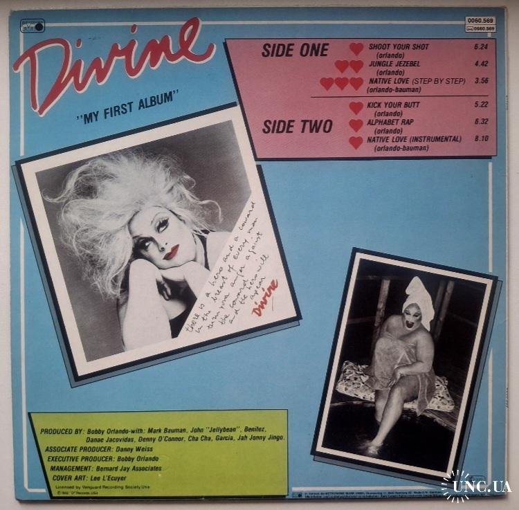 Вінілова платівка. Перший, дебютний, в дискографії, студійний альбом, Американського кіноактора, виконавця стилів електронік, поп, хай-енерджі, дрег-королеви Гарріса Гленна Мілстеда, більше відомого під сценічним ім,ям Дівайн (My First Album) 1982. Випуск фірми (Metronome) Germany, 1982-ий рік. Оригінальне першопресове Німецьке видання. Стан платівки ЕХ+. Стан конверту ЕХ+. Відправка по Україні службами доставки: Нова Пошта, Укр Пошта, Делівері. Також відправляємо посилки за кордон по цілому світу.