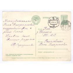 Двухсторонняя маркированная почтовая карточка СССР с маркой 8-го стандартного выпуска 50 копеек "Спасская башня московского кремля" офсет зеленая.