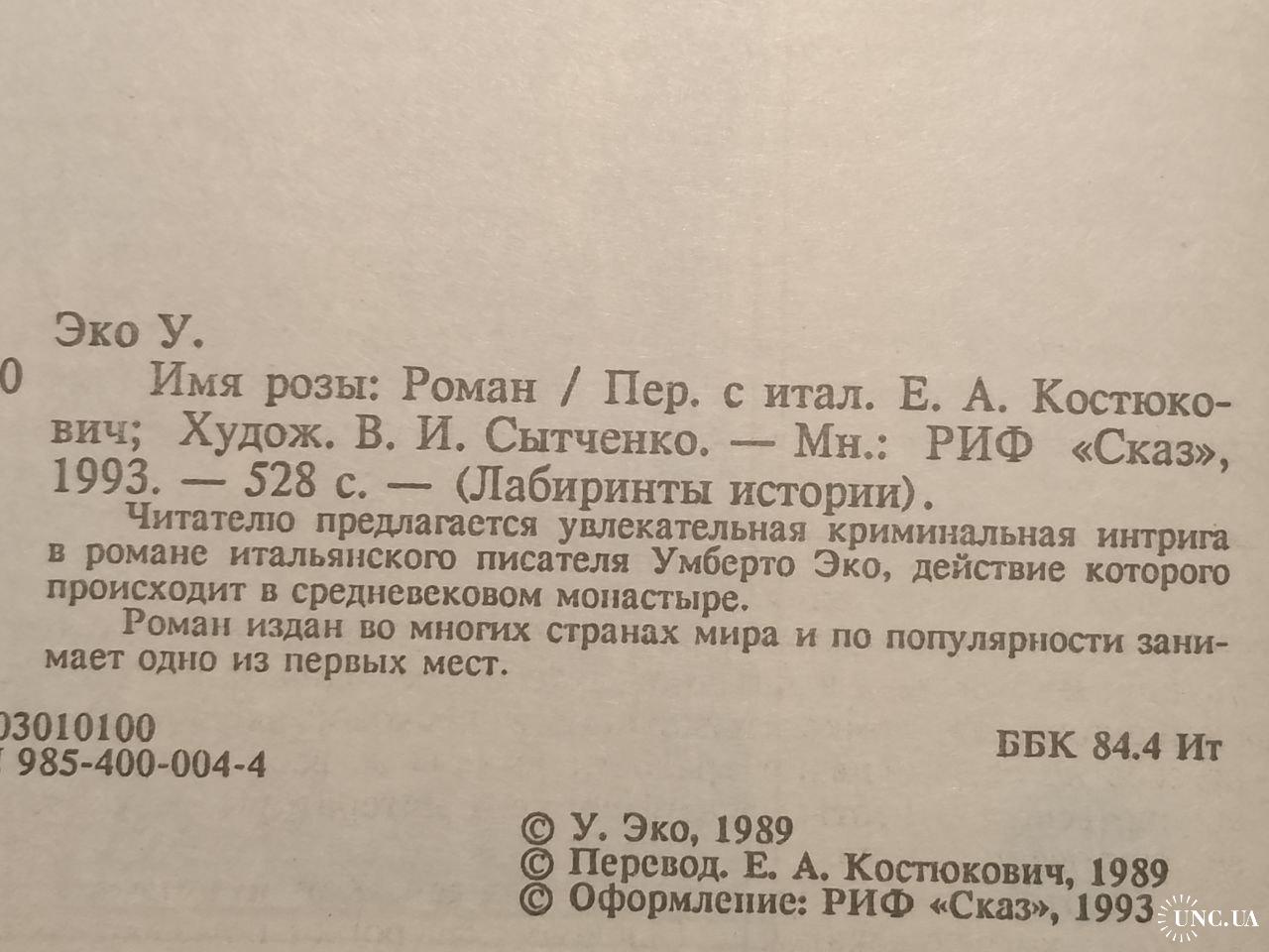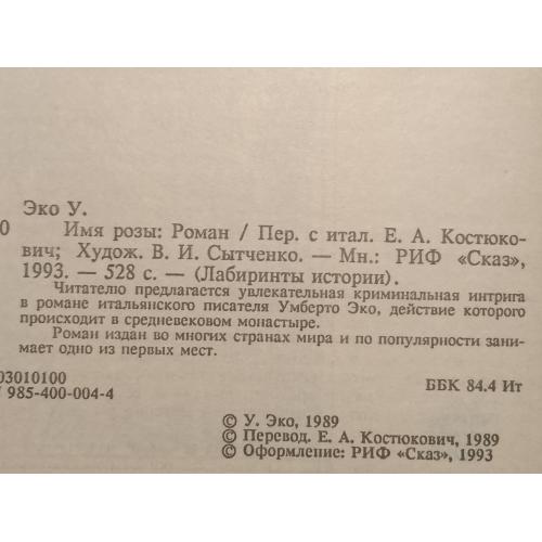 Эко Умберто. Имя розы. Серия Лабиринты истории. Издательство: Минск. РИФ Сказ. 1993 год. Интеллектуальный детектив. Отличное состояние
