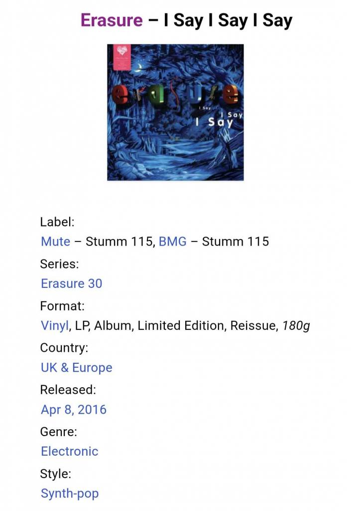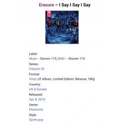 1981-2000Вінілова платівка. Шостий, в дискографії, студійний альбом, Британського електронного сінті поп дуету Erasure, який складається з виконавців Вінса Кларка та Енді Бела (I Say I Say I Say) 1994. Випуск фірми (BMG / Mute) Europe & UK, 2016-ий рік. Лімітований тираж (Limited Edition). Видання нове, запаковане. Категорія S/S. Відправка по Україні службами доставки: Нова Пошта, Укр Пошта, Делівері. Також відправляємо посилки за кордон по цілому світу.