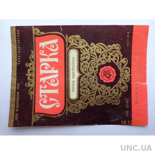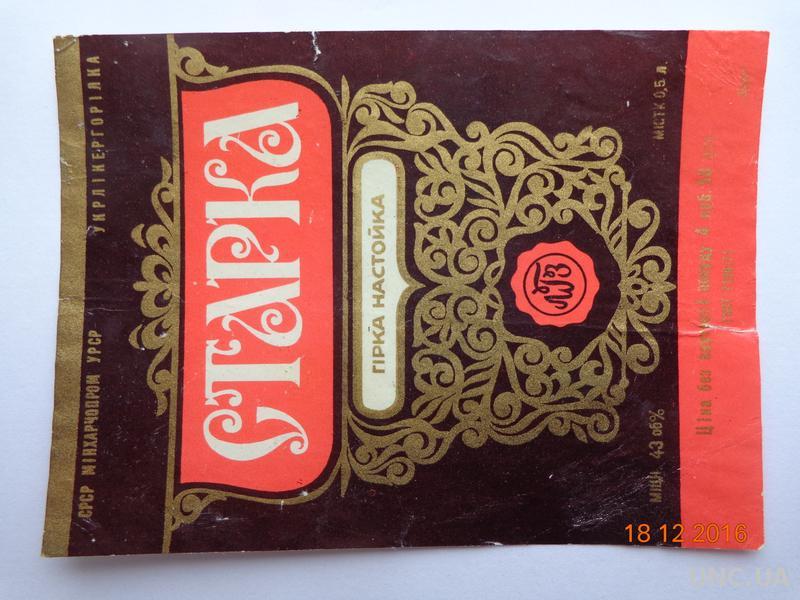 Этикетка горькая настойка "Старка 43%" (ЛГЗ, УССР, СССР, 1978) редкая