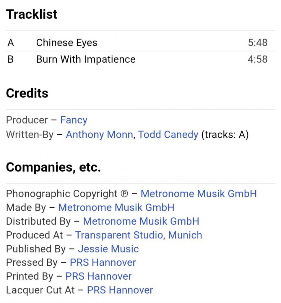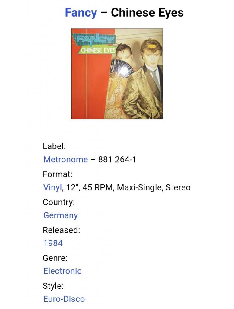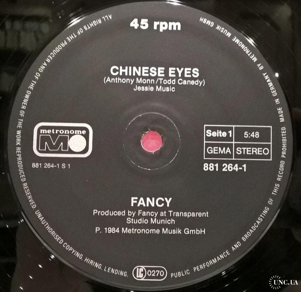 1981-2000Вінілова платівка. Другий, в дискографії, студійний максі сингл (EP 12), Німецького євро диско виконавця, Манфреда Алоїс Зегіта, більше відомого під сценічним ім,ям Fancy (Chinese Eyes)) 1984. Випуск фірми (Metronome) Germany, 1984-ий рік. Оригінальне, рідне, першопресове Німецьке видання. Стан платівки ЕХ+. Стан конверту ЕХ+. Відправка по Україні службами доставки: Нова Пошта, Укр Пошта, Делівері. Також відправляємо посилки за кордон по цілому світу.