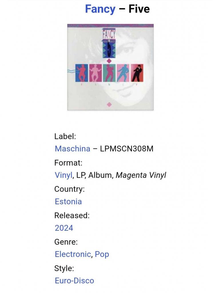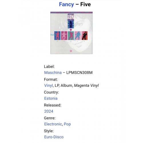 1981-2000Вінілові платівки. П,ятий, в дискографії, студійний, альбом Німецького євро диско виконавця, Манфреда Алоїс Зегіта, більше відомого під сценічним ім,ям Fancy (Five) 1990. Випуск фірми (Maschina) Estonia, 2024-ий рік. Кольоровий вініл (Coloured Vinyl). Лімітований тираж (Limited Edition). Видання нове, запаковане. Категорія S/S. Відправка по Україні службами доставки: Нова Пошта, Укр Пошта, Делівері. Також відправляємо посилки за кордон по цілому світу.