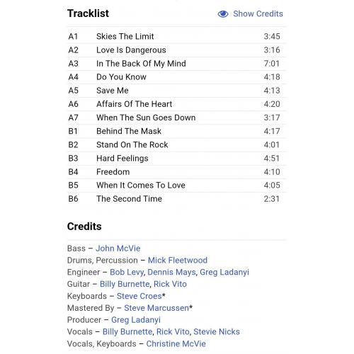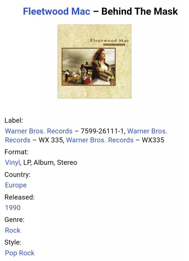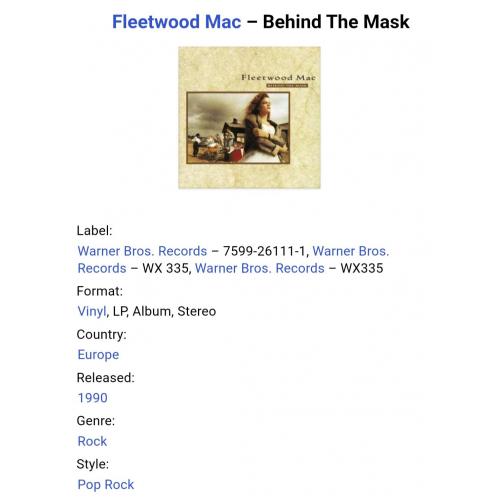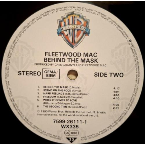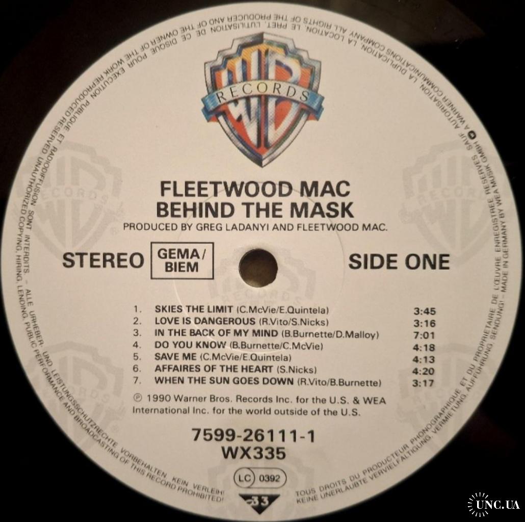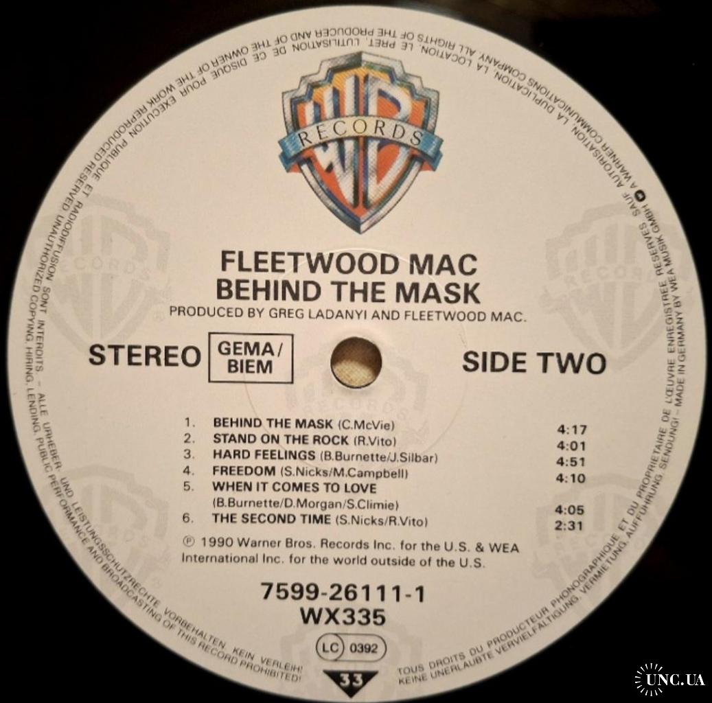 Вінілова платівка. Шістнадцятий, в дискографії, студійний альбом Британсько-Американської поп-рок, блюз-рок групи Fleetwood Mac, до складу якої на той час входили Мік Флітвуд, Джон МакВі, Стіві Нікс, Рік Віто, Білі Бернет та Крістін МакВі (Behind The Mask) 1990. Випуск фірми (Warner Bros. Records) Germany, 1990-ий рік. Оригінальне, першопресове Німецьке видання. Стан платівки EX+. Конверт ламінований. Стан конверту EX+. В комплекті внутрішня вставка. Відправка по Україні службами доставки: Нова Пошта, Укр Пошта, Делівері. Також відправляємо посилки за кордон по цілому світу.