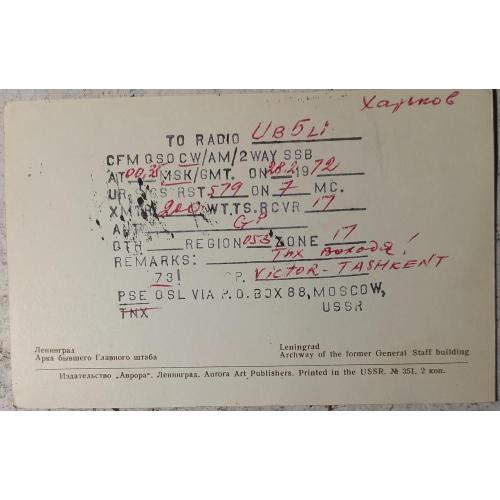 1961-1980Черно-белая открытка. Изд-во «Аврора», Ленинград. Заполнена, как QSL-карточка. Без дефектов. Состояние отличное.