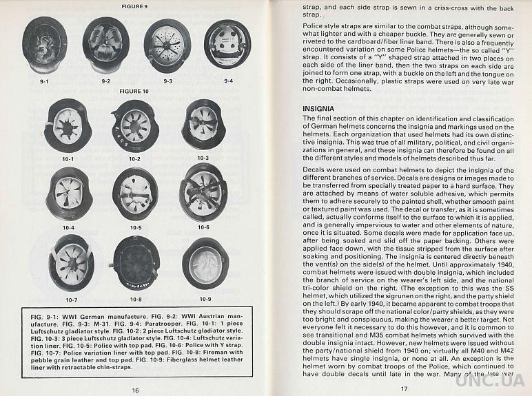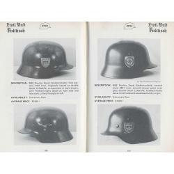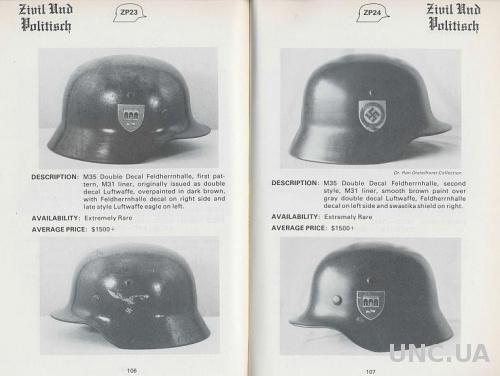 Каталог из книг по основным типам и моделям немецких шлемов 1933-1945. Представлено большое количество цветных и черно-белых фотографий, отличительные знаки (декали) и клейма производителя, классификация материала.