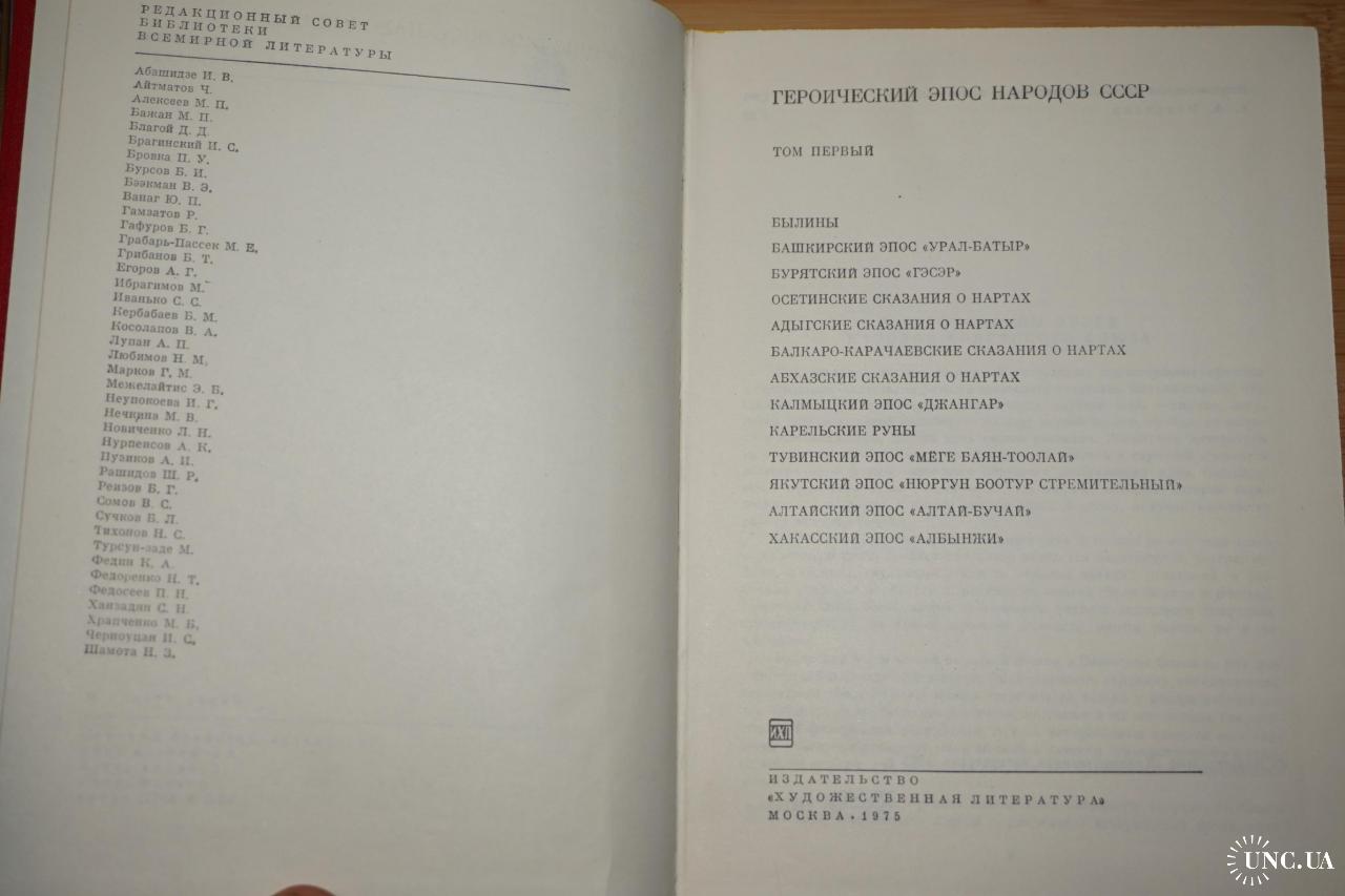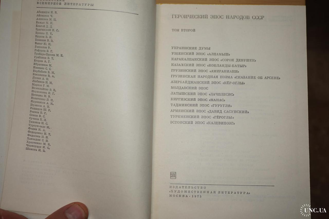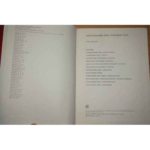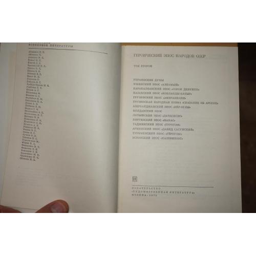 Том 1. `Былины. Башкирский эпос ``Урал-батыр``. Бурятский эпос ``Гэсэр``. Осетинские сказания о нартах. Адыгские сказания о нартах. Балкаро-карачаевские сказания о нартах. Абхазские сказания о нартах. Калмыцкий эпос ``Джангар``. Карельские руны. Тувинский эпос ``Меге баян-тоолай``. Якутский эпос ``Нюргун боотуг стремительный``. Алтайский эпос ``Алтай-бучай``. Хакасский эпос ``Албынжи``.` / Том 2. `Украинские думы. Узбекский эпос ``Алпамыш``. Каракалпакский эпос ``Сорок девушек``. Казахский эпос ``Кобланды-батыр``. Грузинский эпос ``Амираниани``. Грузинская народная поэма ``Сказание об арсене``. Азербайджанский эпос ``Кер-оглы``. Молдавский эпос. Латышский эпос ``Лачплесис``. Киргизский эпос ``Манас``. Таджикский эпос ``Гуругли``. Армянский эпос ``Давид Сасунский``. Туркменский эпос ``Героглы``. Эстонский эпос ``Калевипоэг``.`